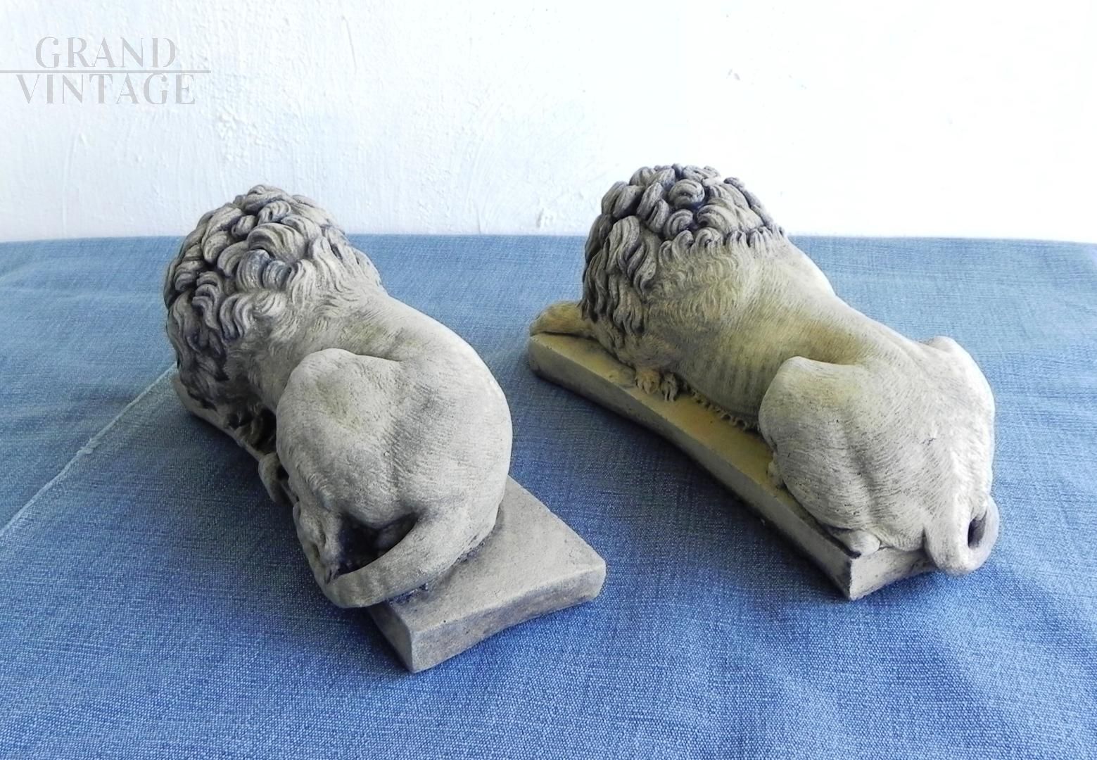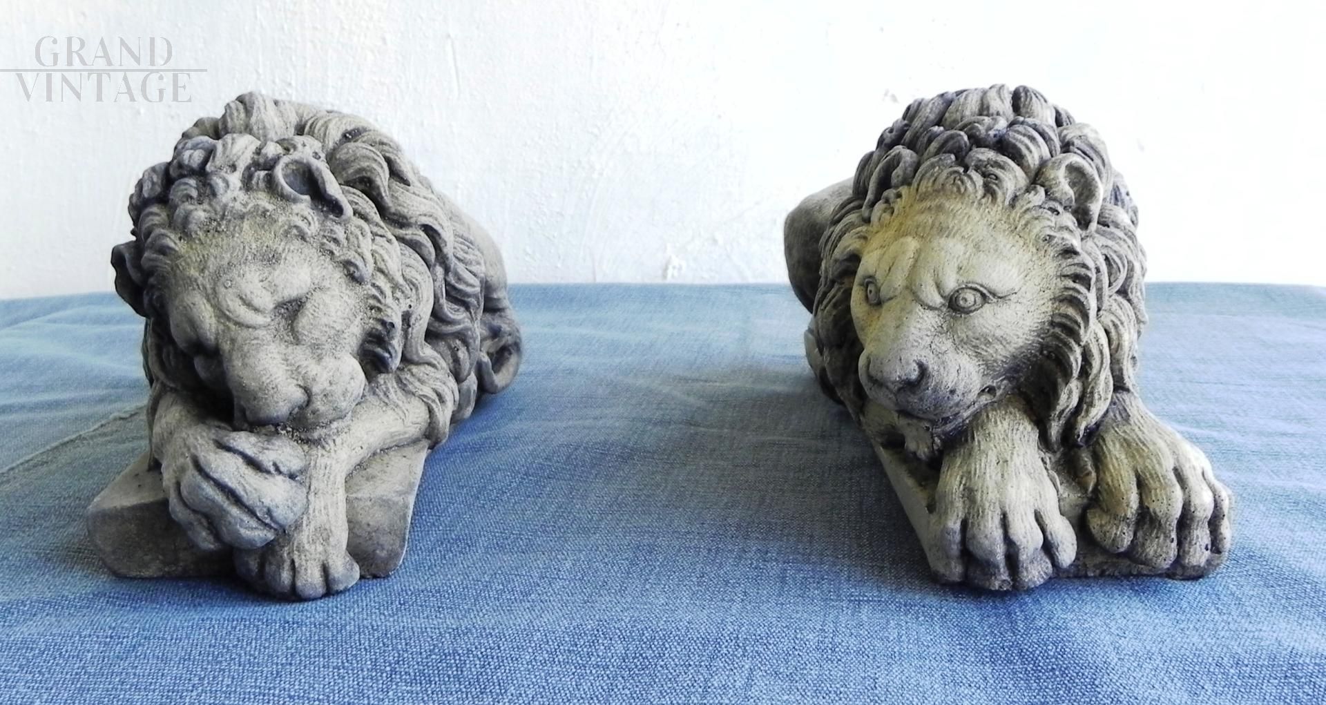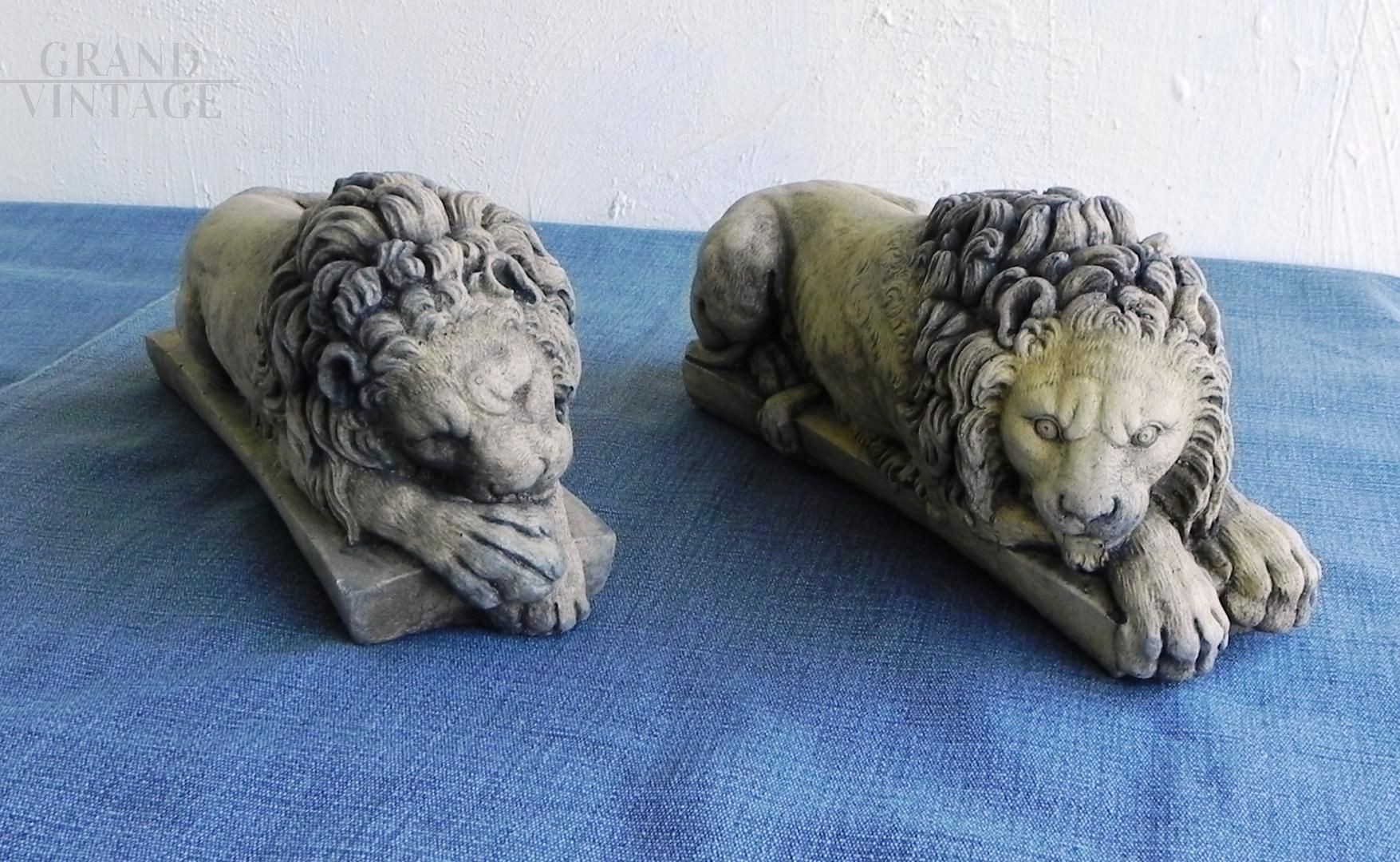 Coppia di sculture raffiguranti leoni dormienti in pietra ricostruita, macinata e colata in stampo, ispirati alle statue originali di Antonio Canova dell'800 che si trovano a Chatsworth House in Inghilterra. Di piccole dimensioni ma dalla esecuzione perfetta, peso 3 kg cad.