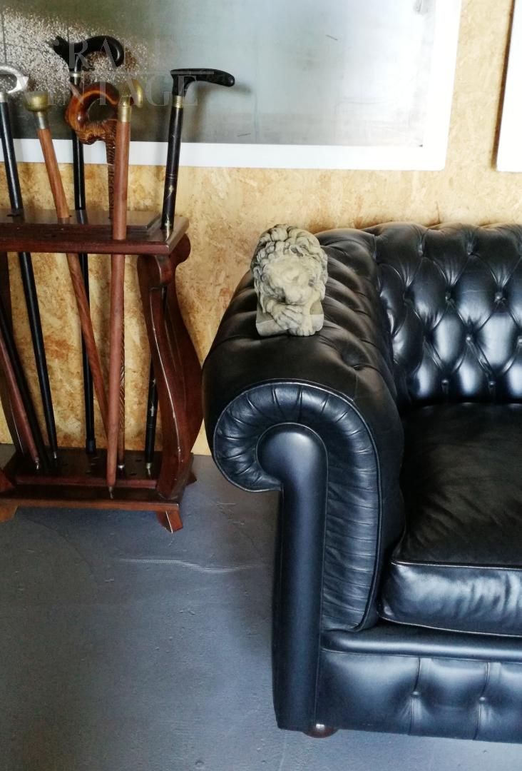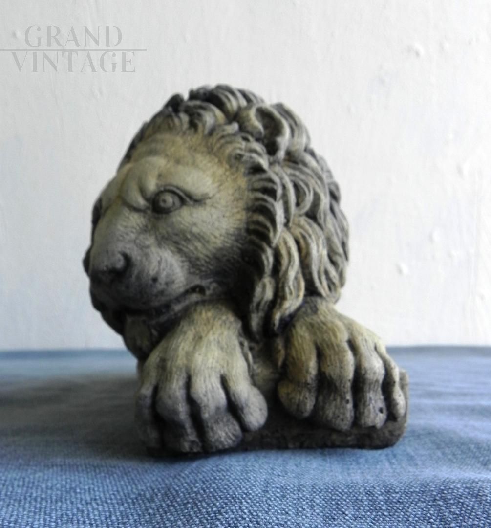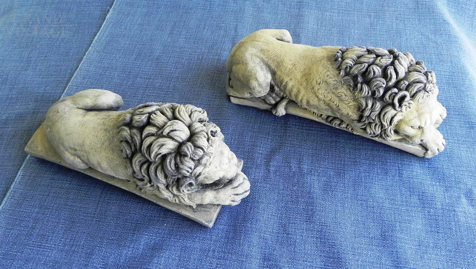 Coppia di sculture raffiguranti leoni dormienti in pietra ricostruita, macinata e colata in stampo, ispirati alle statue originali di Antonio Canova dell'800 che si trovano a Chatsworth House in Inghilterra. Di piccole dimensioni ma dalla esecuzione perfetta, peso 3 kg cad.