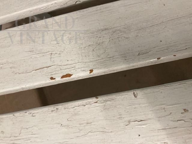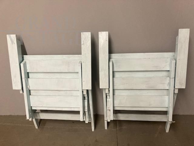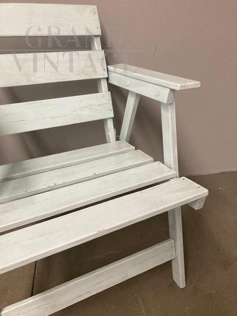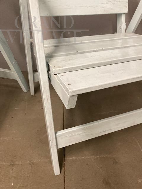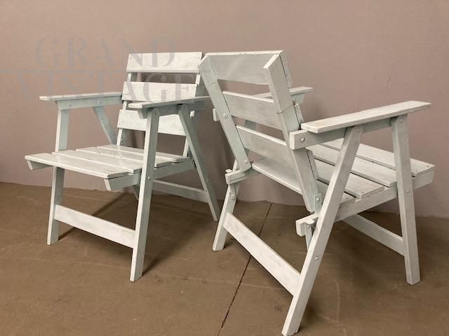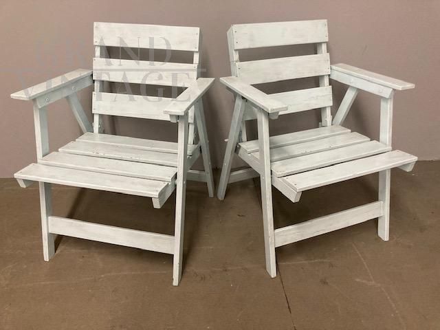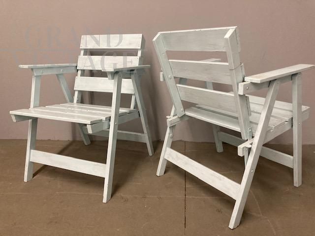 Coppia di poltrone vintage da esterno o interno in stile shabby chic, anni '50, in legno laccato, con piccoli segni del tempo che le rendono dal fascino unico. Le poltrone sono pieghevoli, in buone condizioni, pronte da utilizzare.