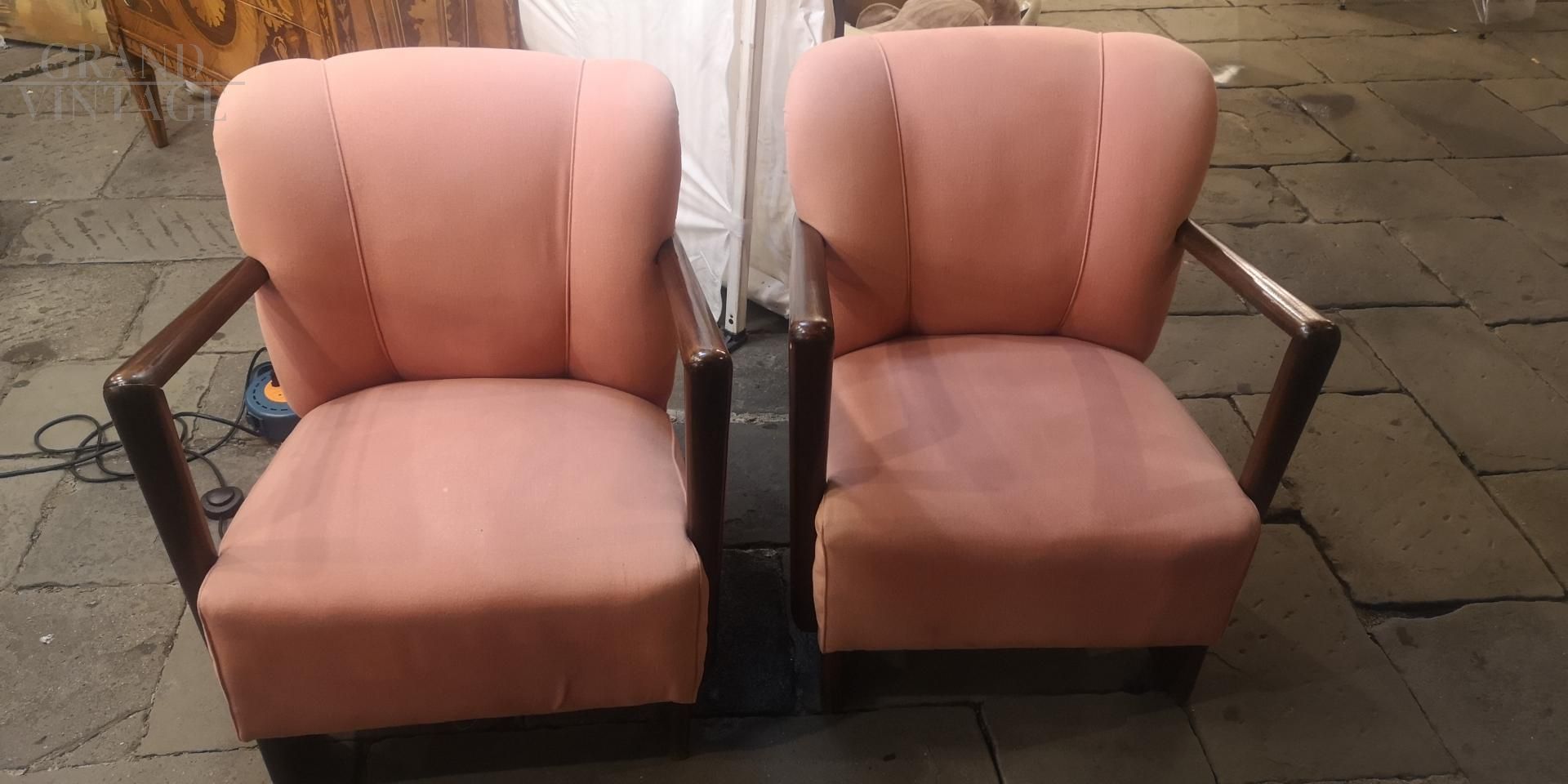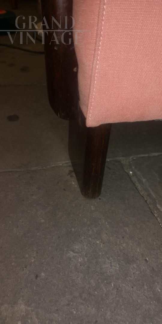 Bellissima coppia di poltrone anni '50 in tessuto originale color rosa antico, con bracciolo a squadra e piede a paletta.