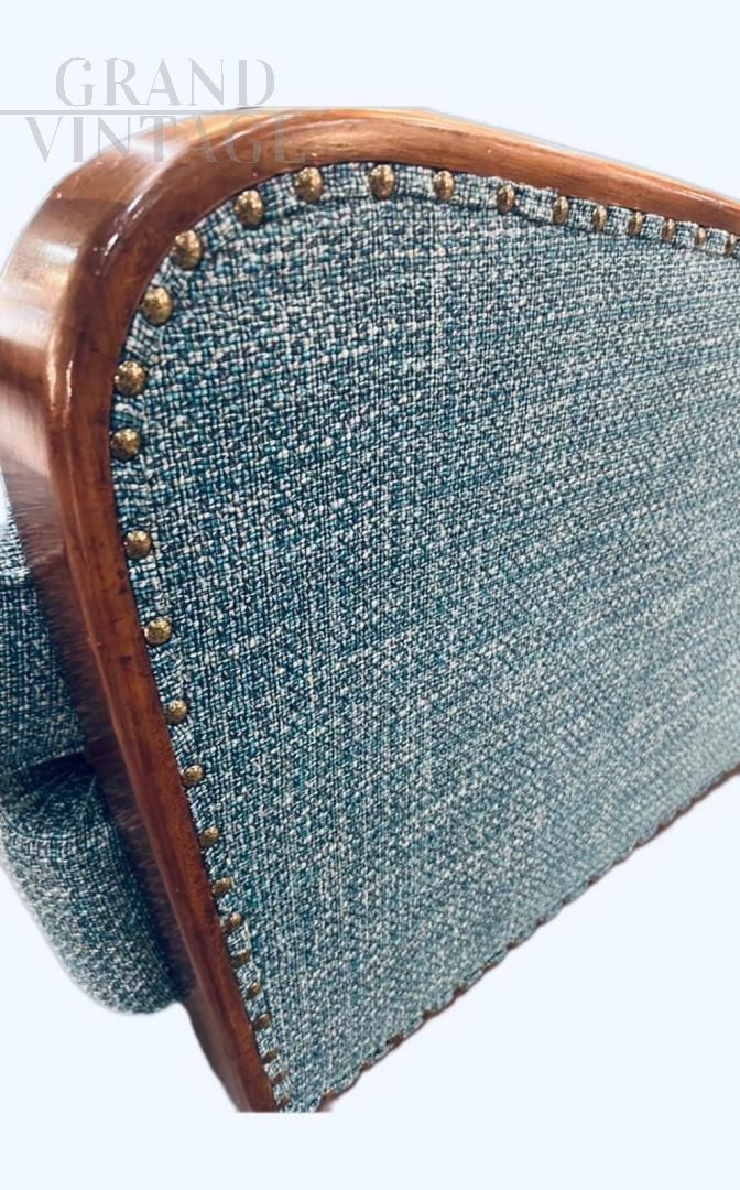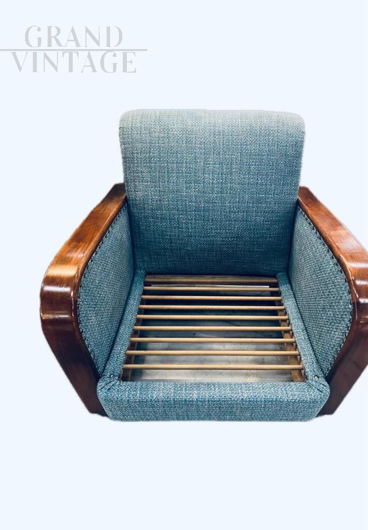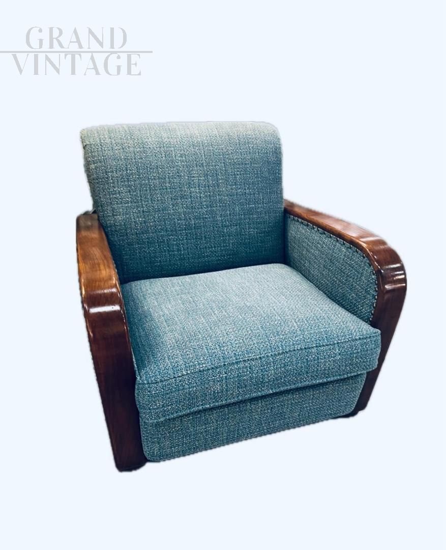 Coppia di poltrone Art Déco con struttura in legno di noce chiaro e rivestimento in tessuto azzurro, sono in perfette condizioni in quanto recentemente restaurate e ritappezzate. Seppur di dimensioni contenute, queste poltrone sono molto comode ed avvolgenti.