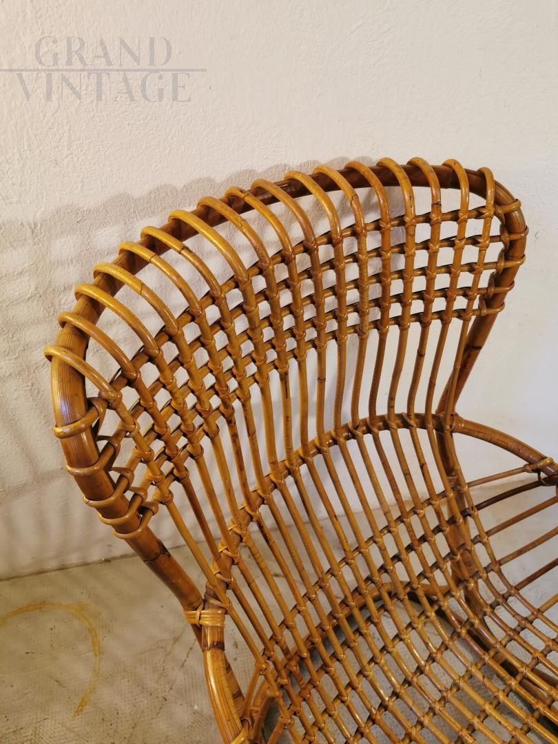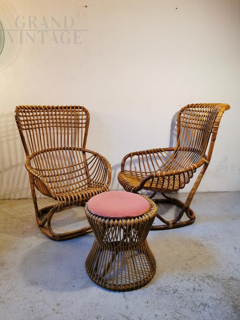 Set da giardino vintage in vimini, coppia di poltrone con pouf in midollino e vimini, produzione Tito Agnoli, anni '50.