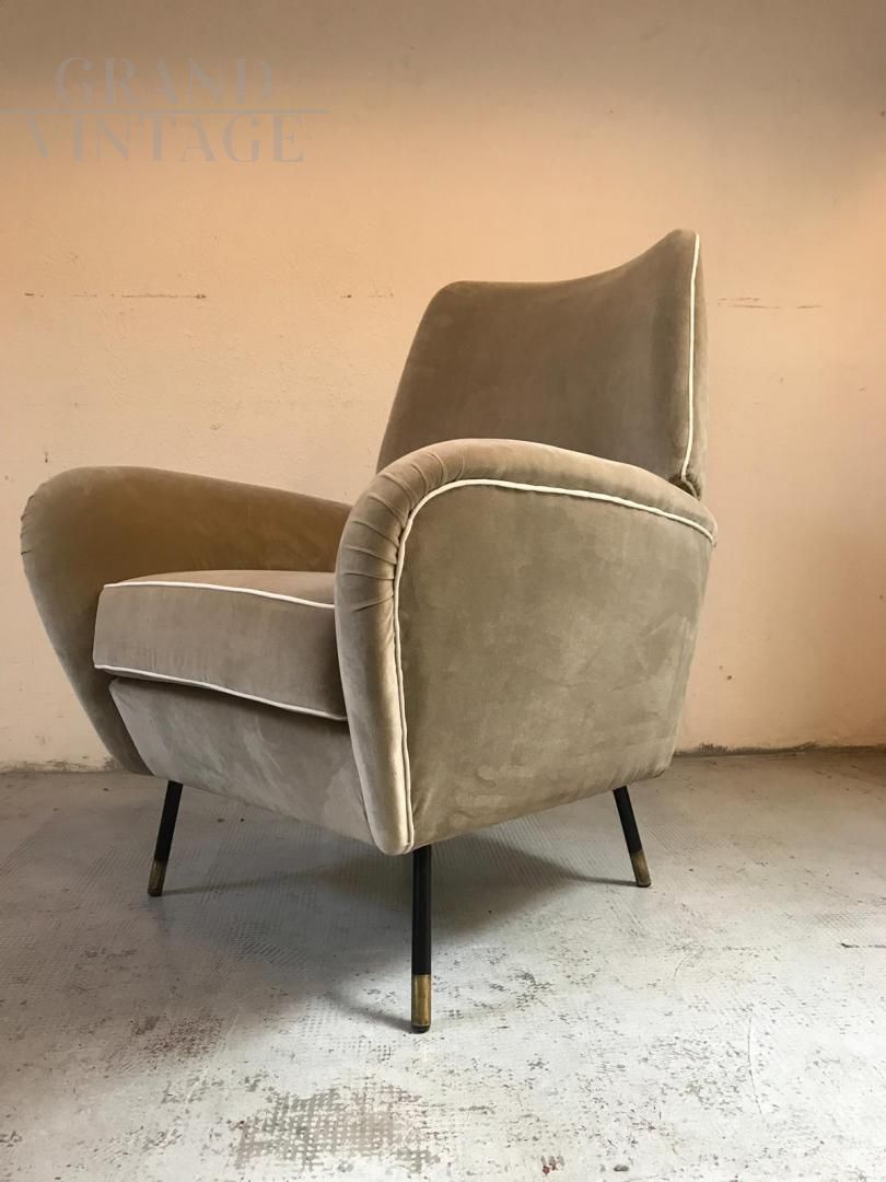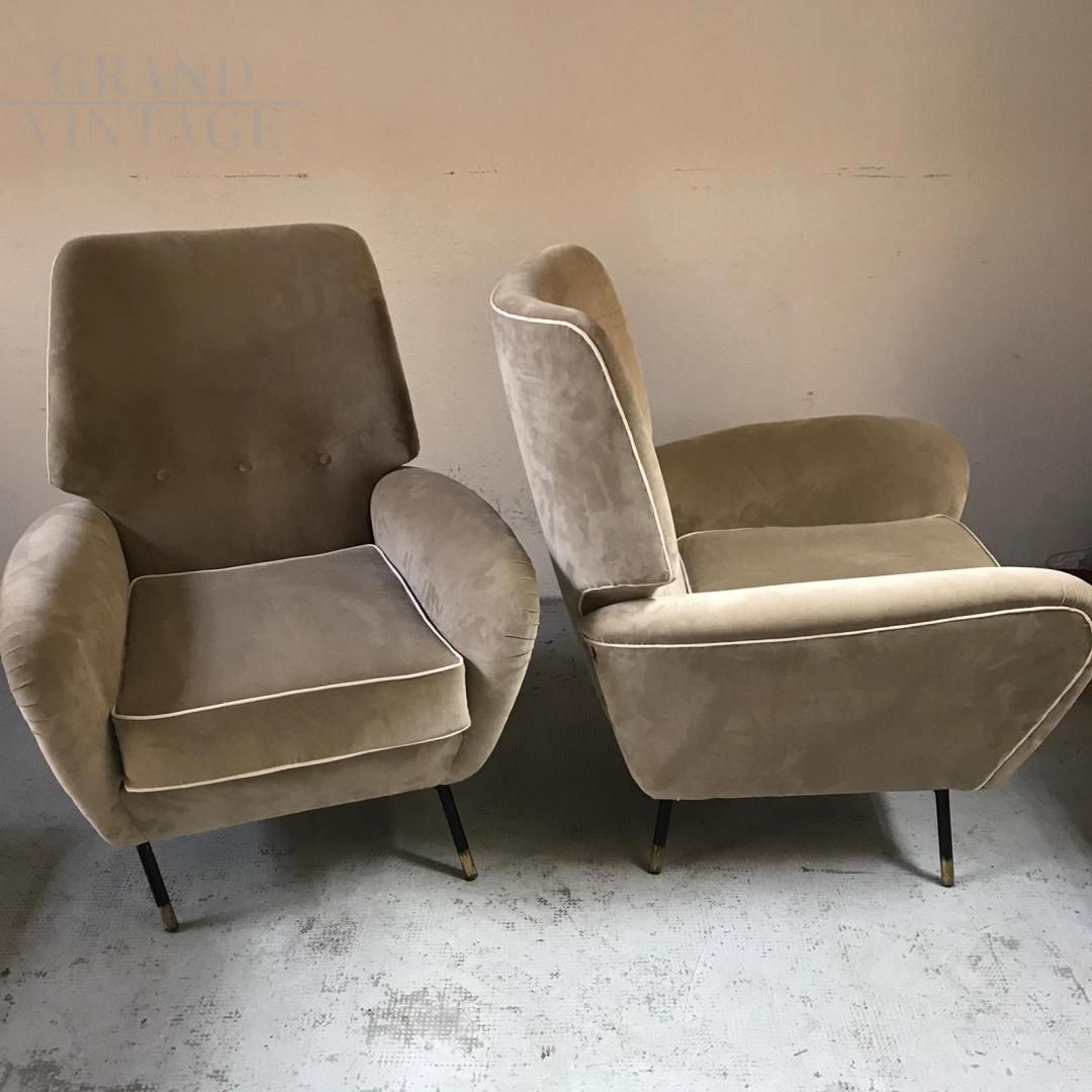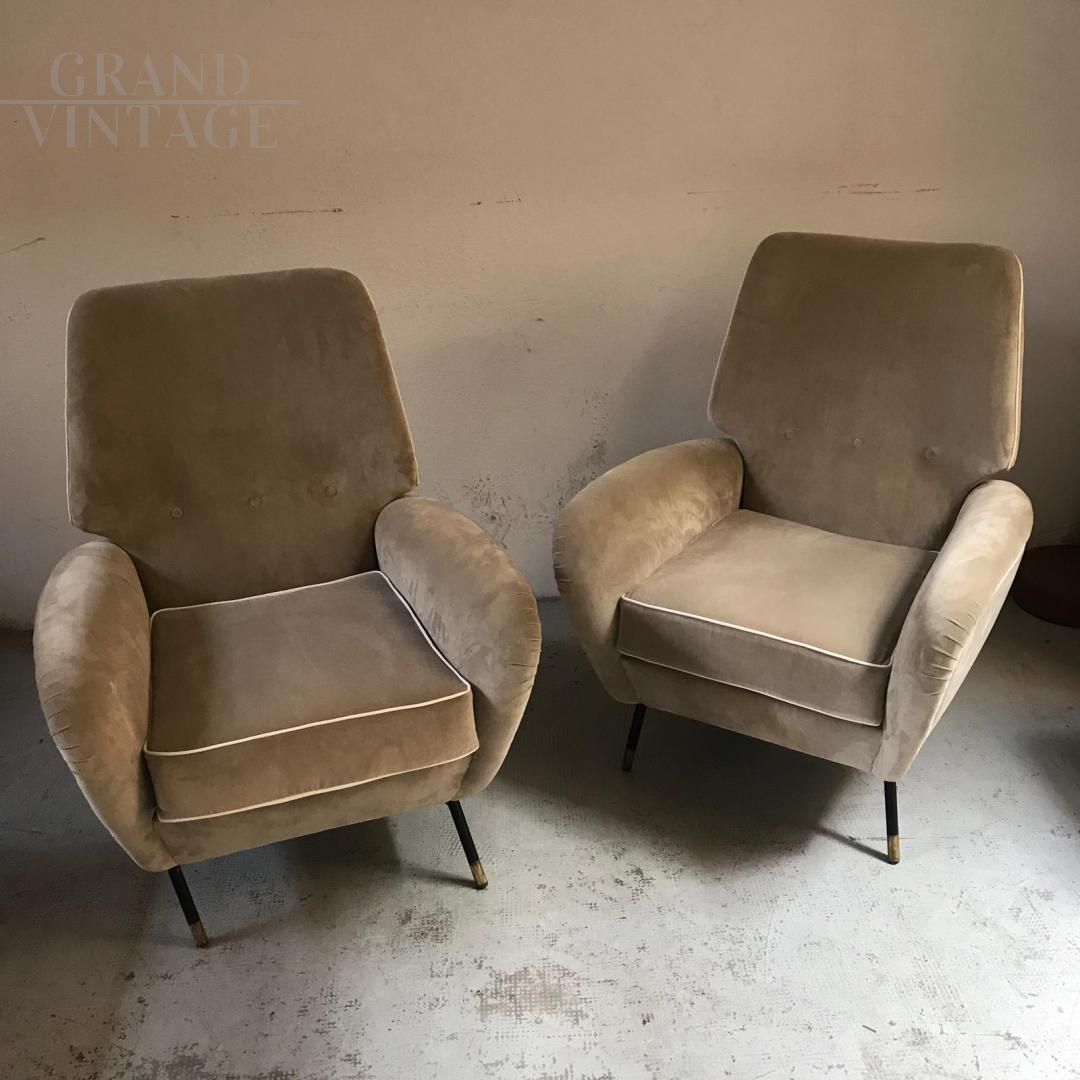 Coppia di poltrone vintge modernariato reclinabili in 3 posizioni, rivestite in velluto color grigio tortora, con gambe laccate di nero e puntali in ottone.