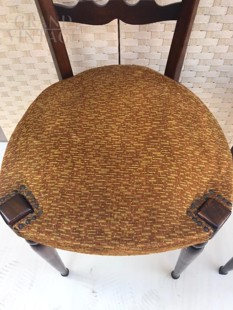 Coppia di sedie Chiavarine con schienale alto, anni '50, in legno di faggio tornito e sedute con tessuto originale. Queste sedie erano un tipico arredo da ingresso, spesso a corredo di una consolle e di un appendiabiti.