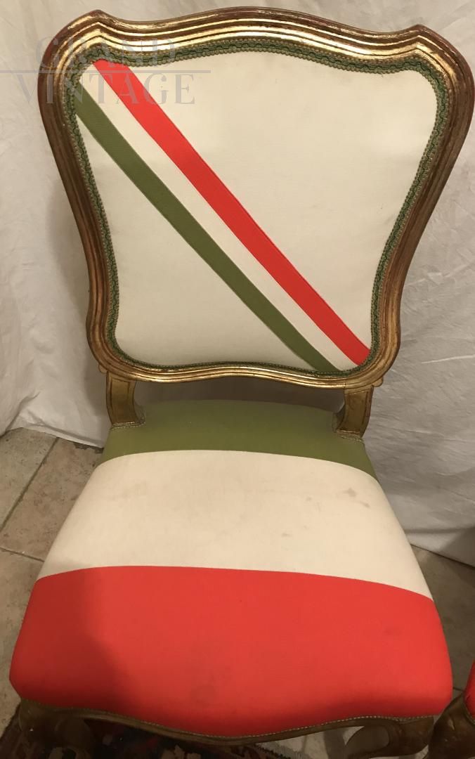 Sedie Barocche rifoderate con i colori della bandiera italiana in occasione dei 150 anni dell’Unità d’Italia.