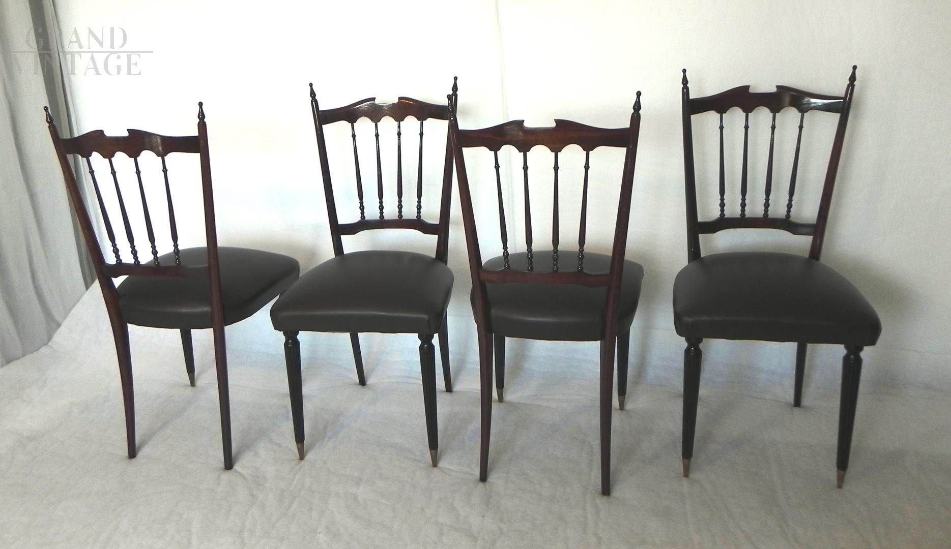 Coppia di sedie tipo Chiavarina in stile Paolo Buffa, anni '60, con struttura in legno di frassino tinto, gambe anteriori con scanalature ammiccanti allo stile Impero. Puntali in ottone decorati, in dotazione gommini anti usura per pavimento in legno. Seduta in ski grigio scuro, imbottitura perfetta. Le sedie pur avendo 60 anni sono pressochè perfette.