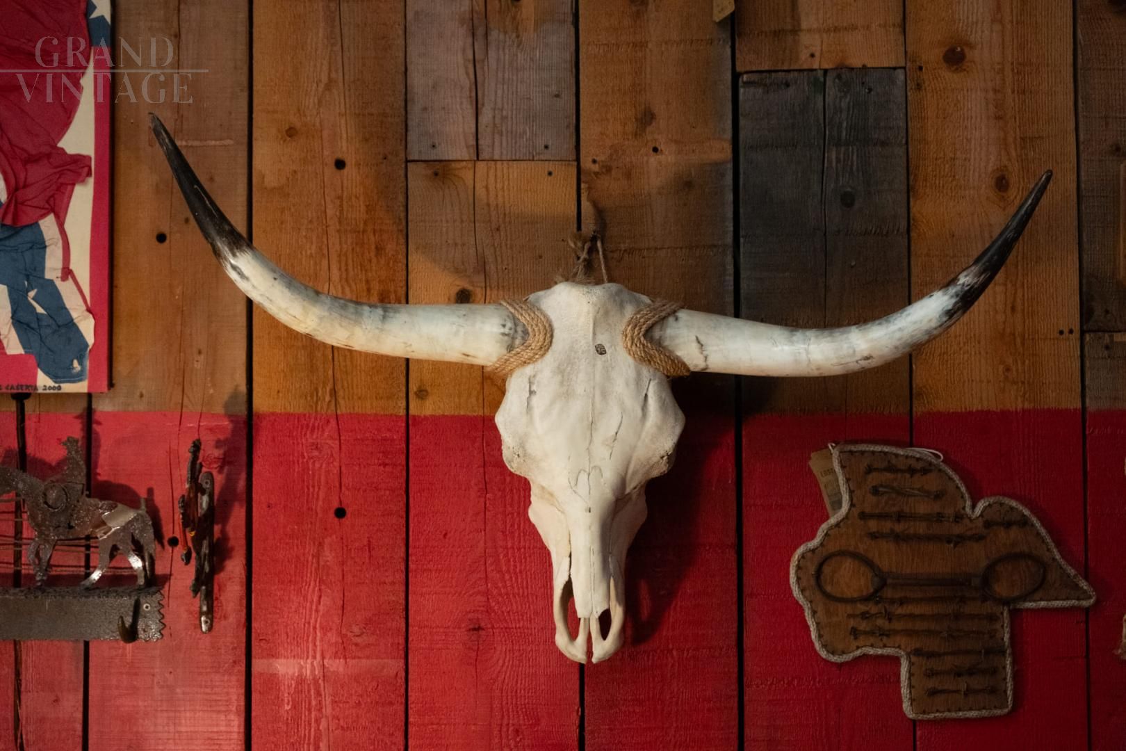 Trofeo in legno con corna di mucca, un pezzo unico di arredamento che aggiunge un tocco di originalità e rusticità alla vostra casa.