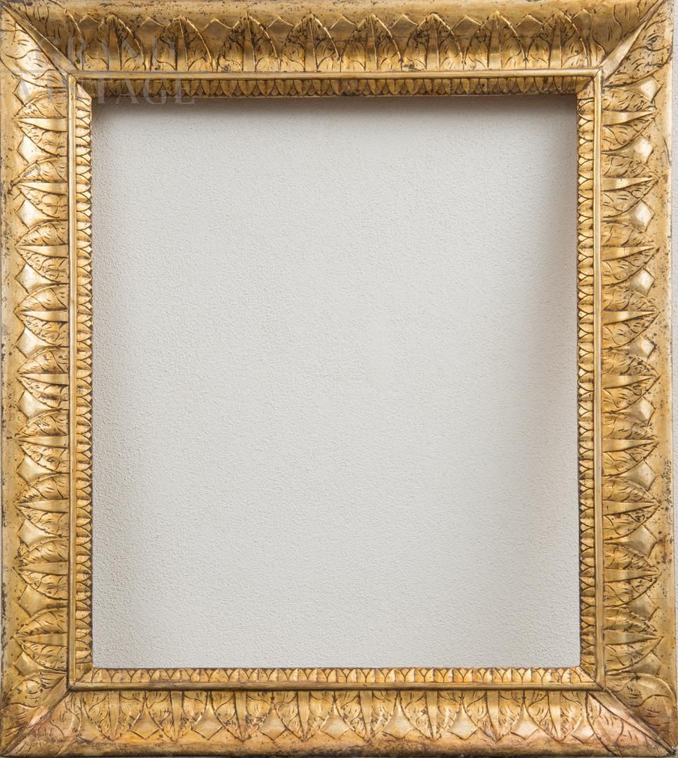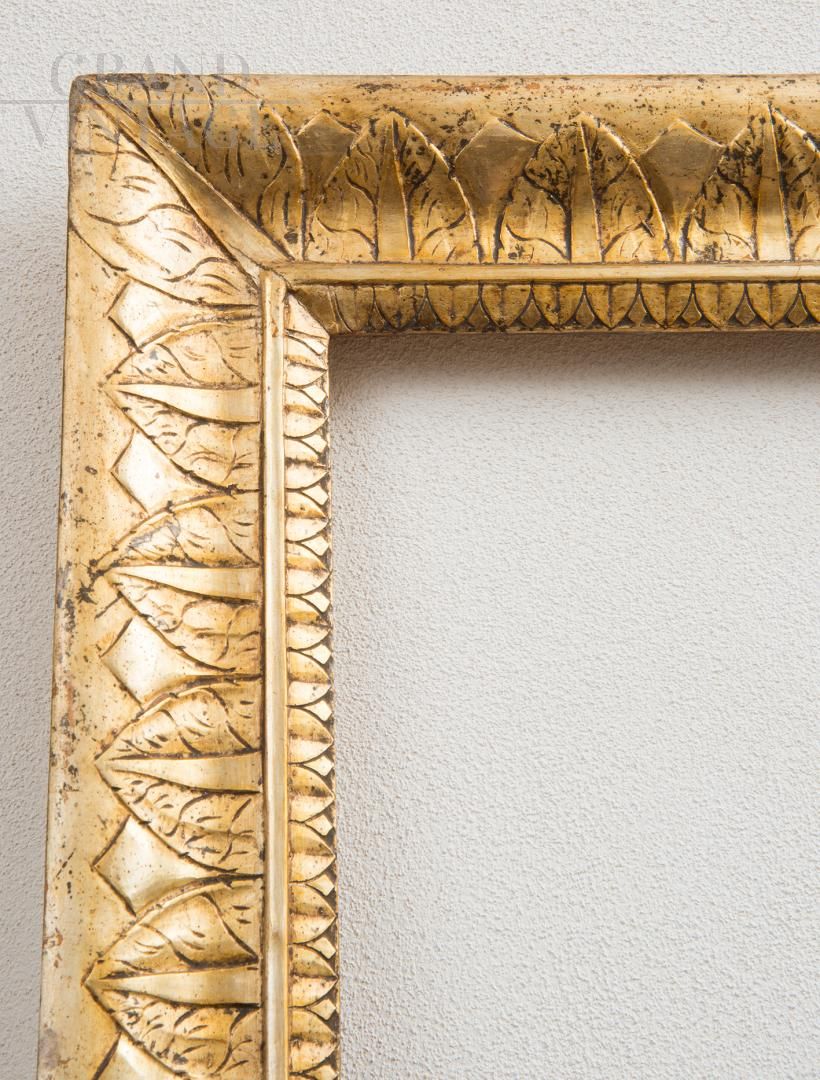 Cornice antica Impero Napoletana in legno dorato e intagliato appartenente alla prima decade del XIX secolo. Tutta la struttura è impreziosita da tre ordini di intaglio a palmette tipiche del periodo Impero di appartenenza. La doratura è oro a foglie 24kt su strato di bolo Armeno. Provenienza: Napoli inizi XIX secolo.
