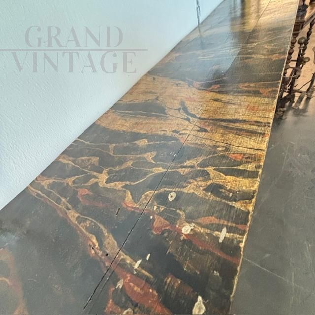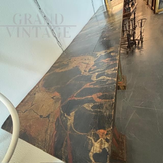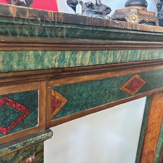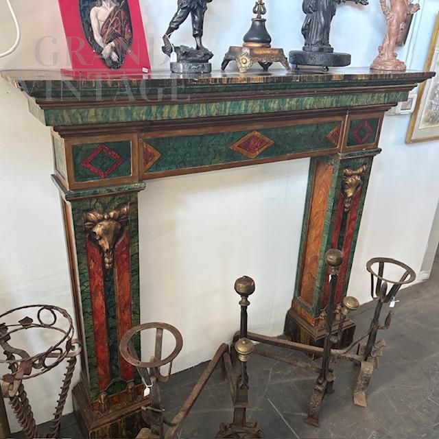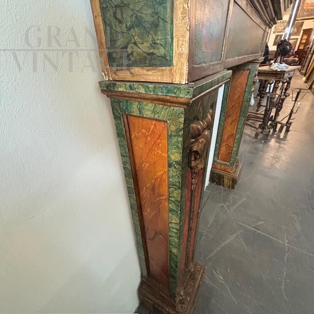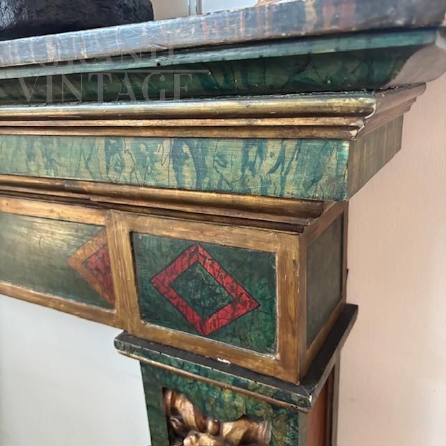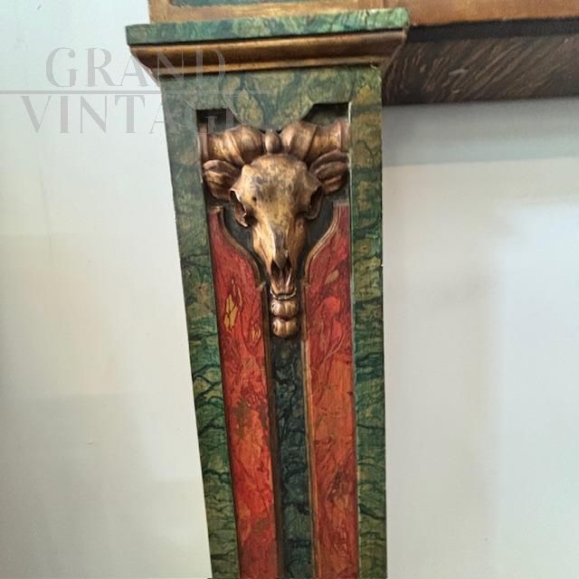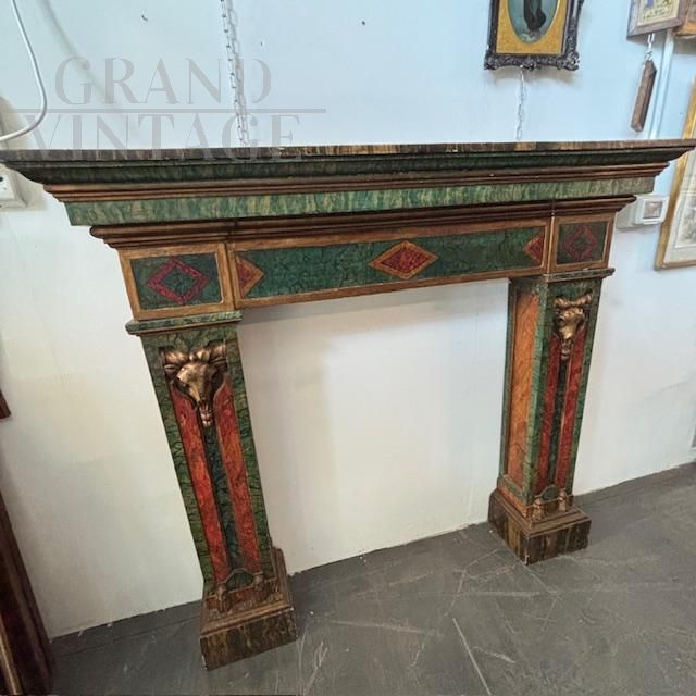 Splendida cornice di camino antica dell'800 in legno massello policromo dipinto a mano con effetto marmo, i montanti sono intagliati con muso di animale caprino dorati. In stato molto buono, il camino presenta piccoli segni di usura.