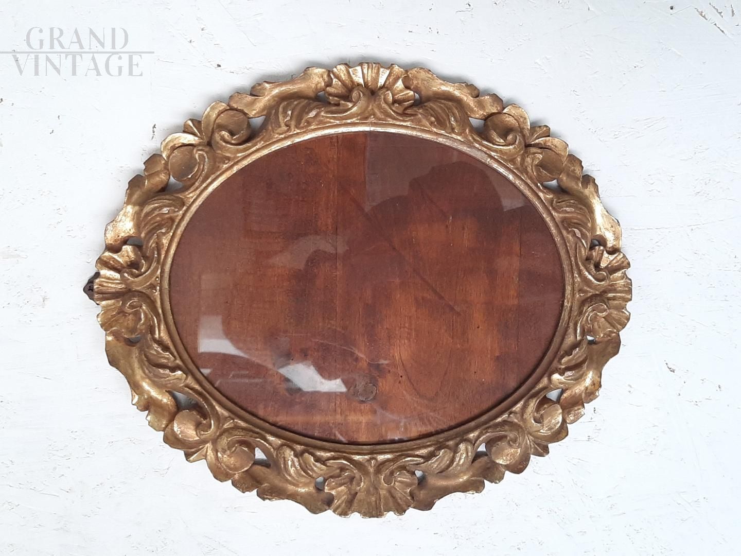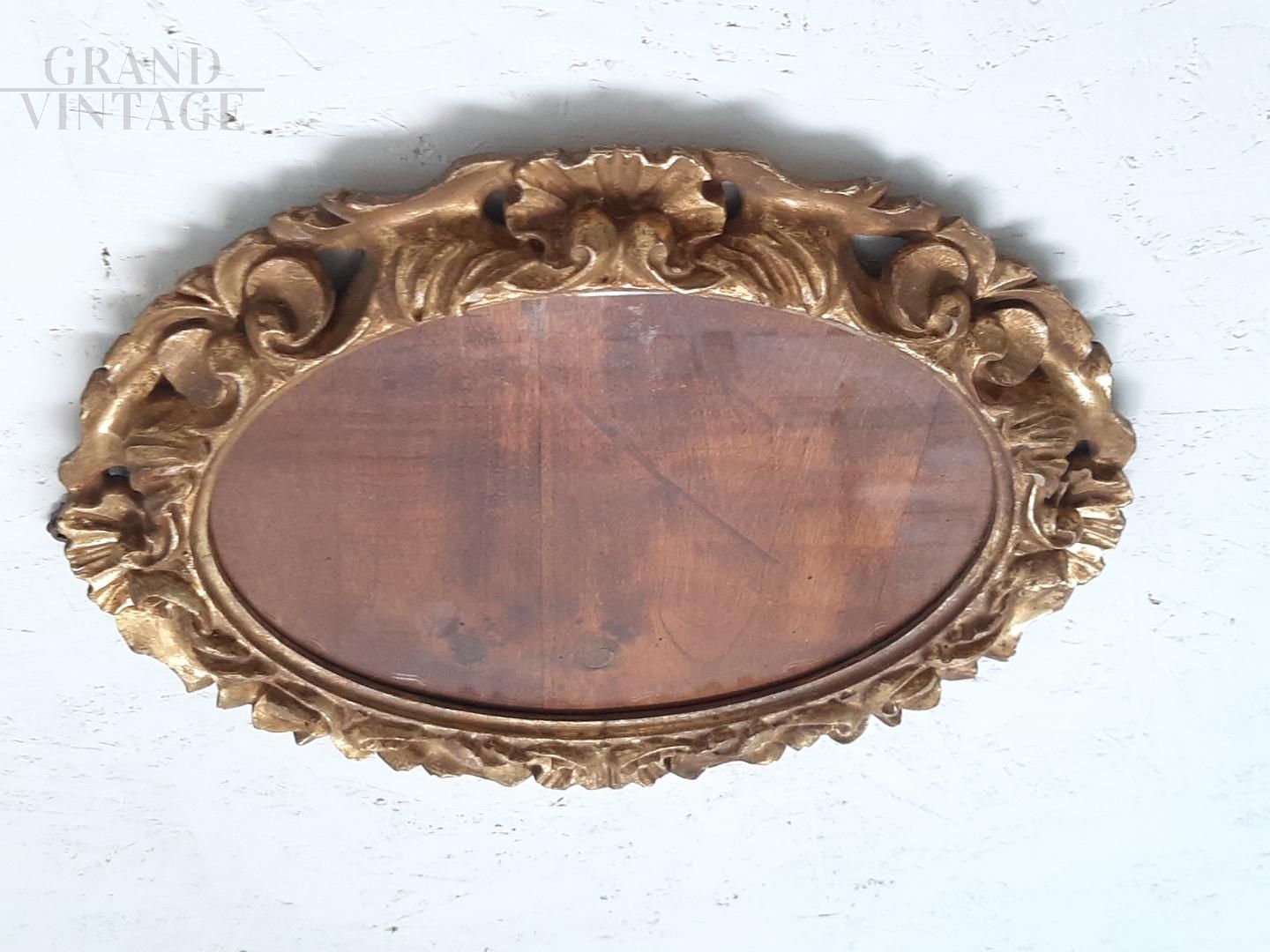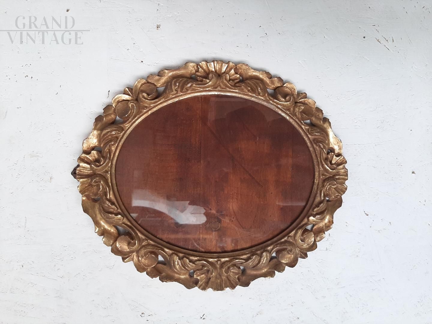 Cornice per specchio vintage ovale in legno finemente intagliato e dorato con doratura originale, della prima metà del '900. La cornice è fornita di vetro. Presenta i naturali segni del tempo.