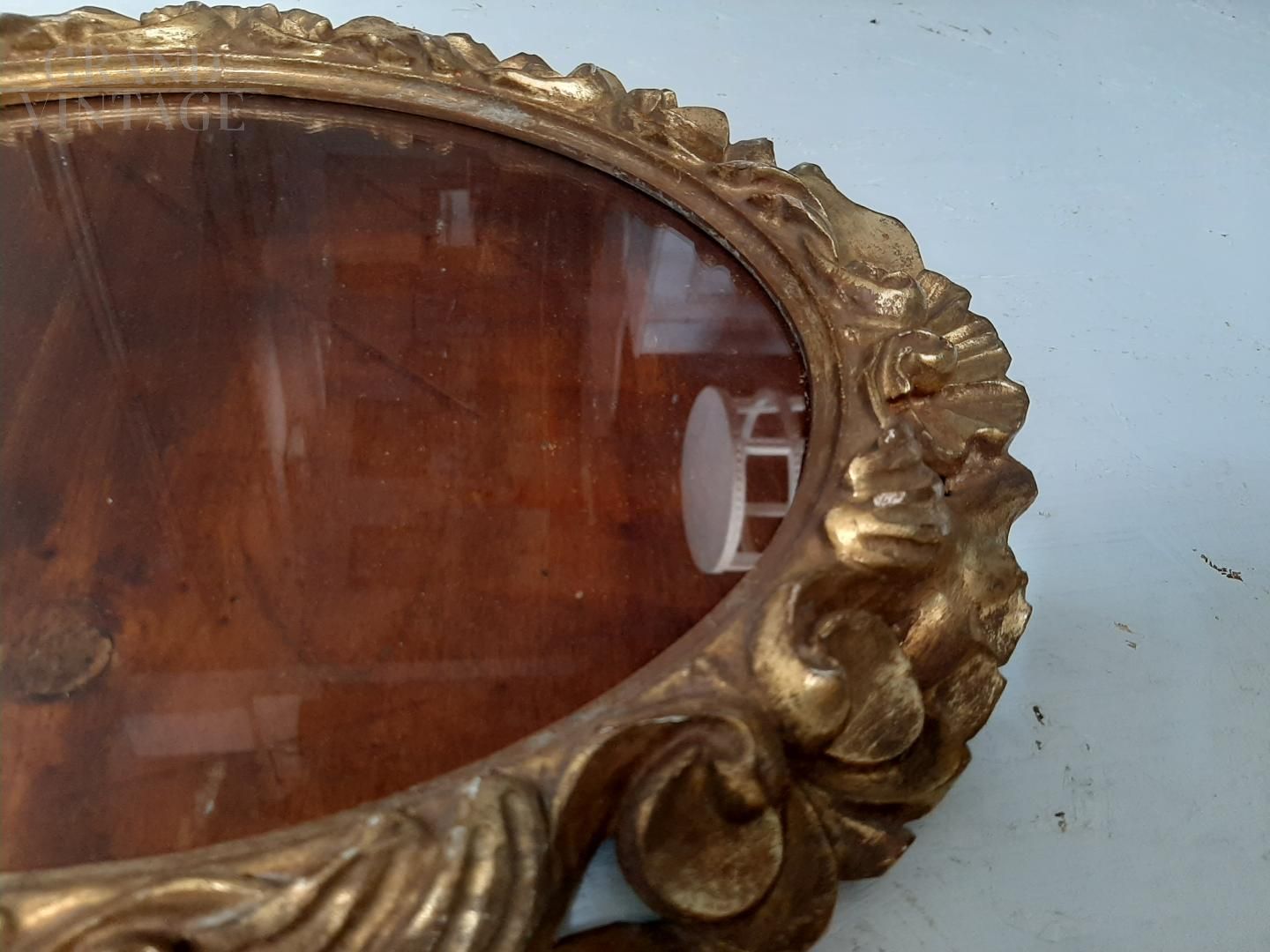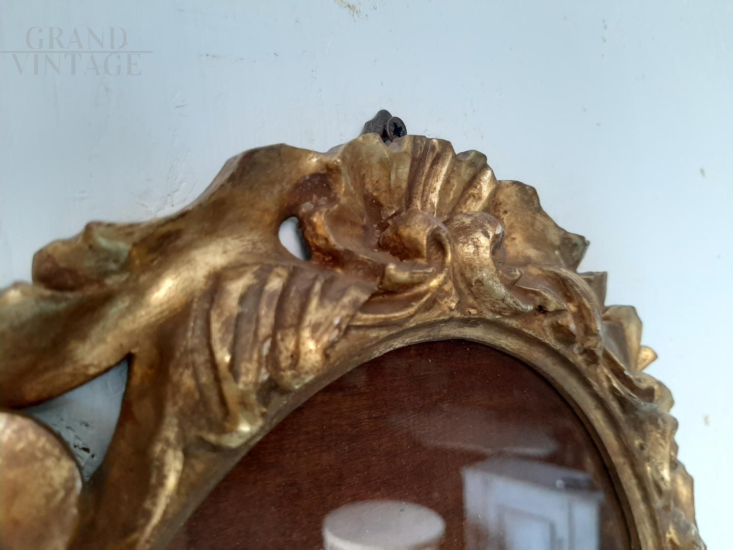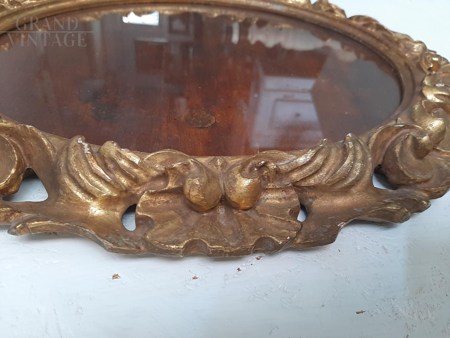 Cornice per specchio vintage ovale in legno finemente intagliato e dorato con doratura originale, della prima metà del '900. La cornice è fornita di vetro. Presenta i naturali segni del tempo.