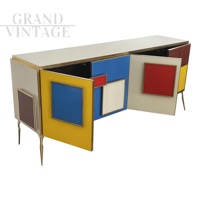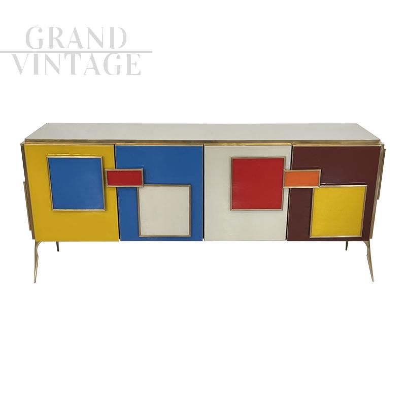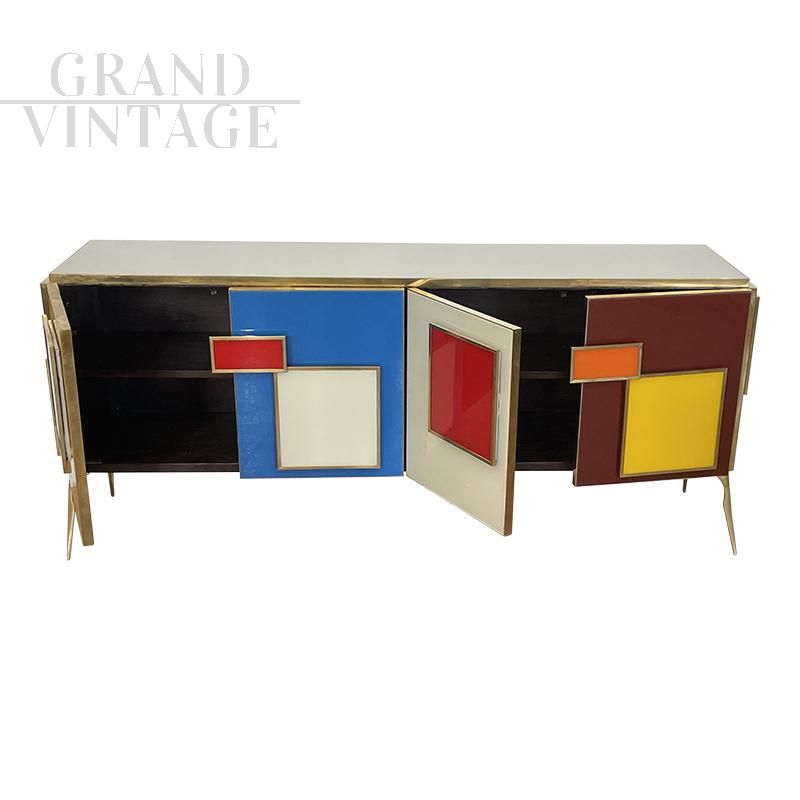 Credenza vintage a quattro ante in stile vintage interamente realizzata a mano, con struttura in legno rivestita in vetro multicolore; profili, maniglie e piedi in ottone dorato, maniglie illuminate con strisce a led, ripiano interno.