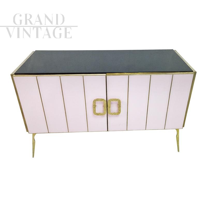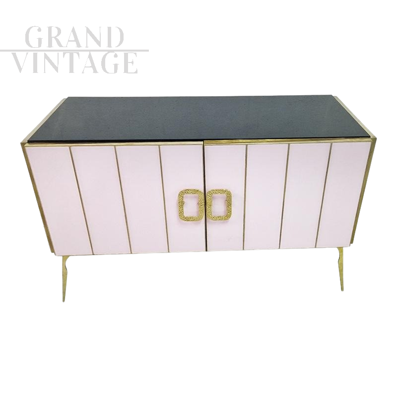 Credenza a 2 ante in vetro rosa e nero ed ottone