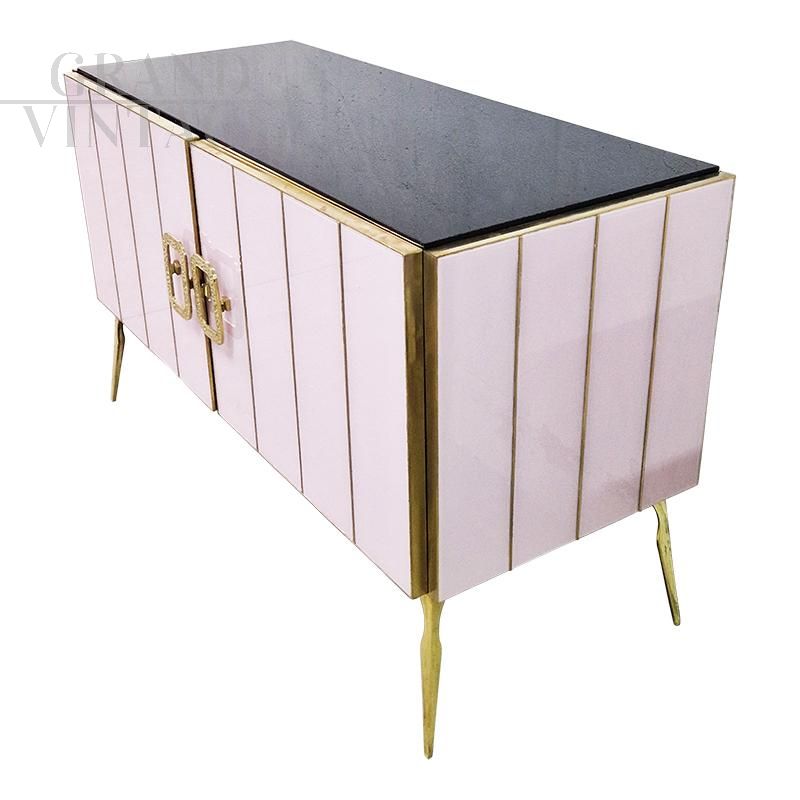 Credenza a due ante interamente realizzata a mano, con struttura in legno rivestita in vetro rosa e nero; profili, maniglie e piedi in ottone dorato.