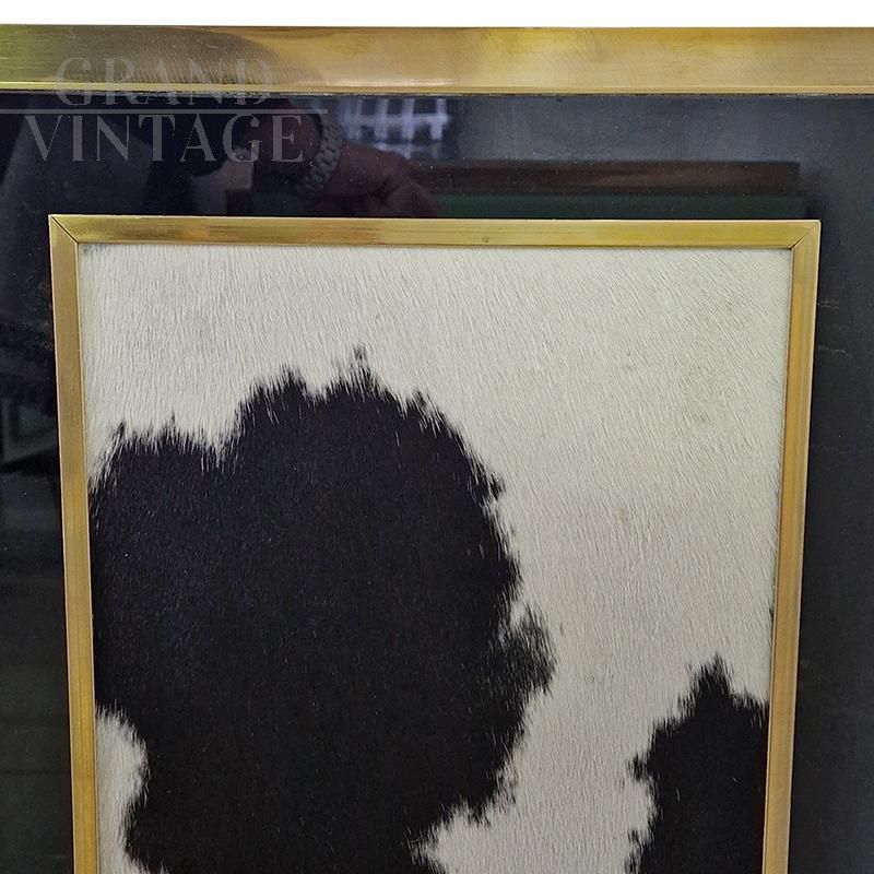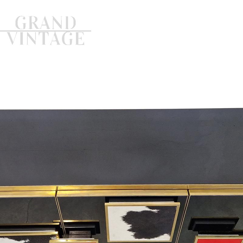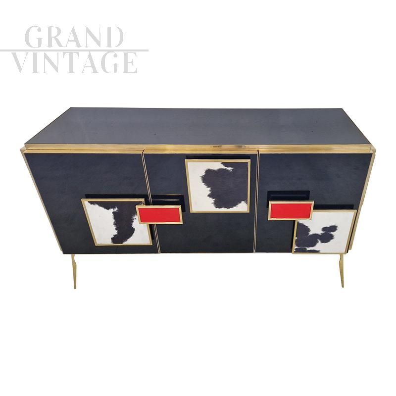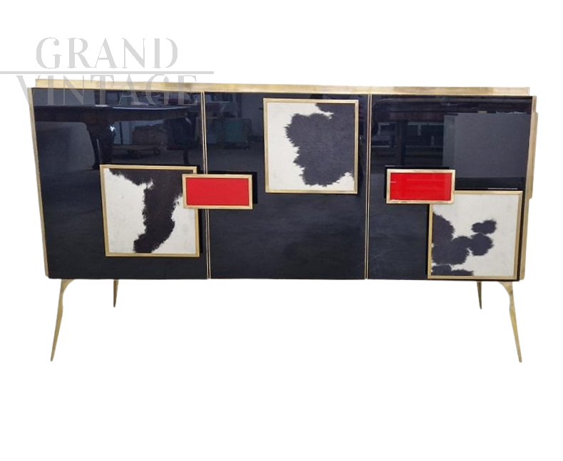 Credenza a tre ante interamente realizzata a mano, con struttura in legno ricoperto in vetro nero e con dettagli in cavallino bianco e nero, maniglie in vetro rosso, profili e piedi in ottone dorato, ripiano interno.
