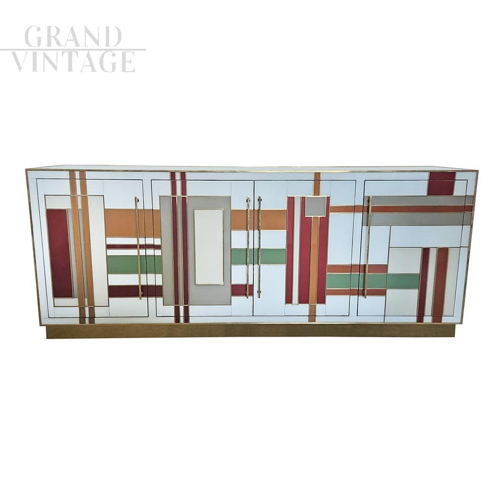 Credenza a 4 ante in vetro bianco con sezioni colorate e ottone