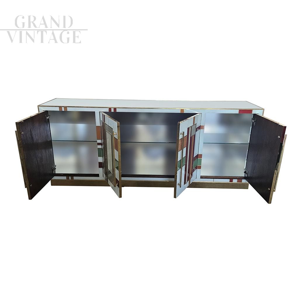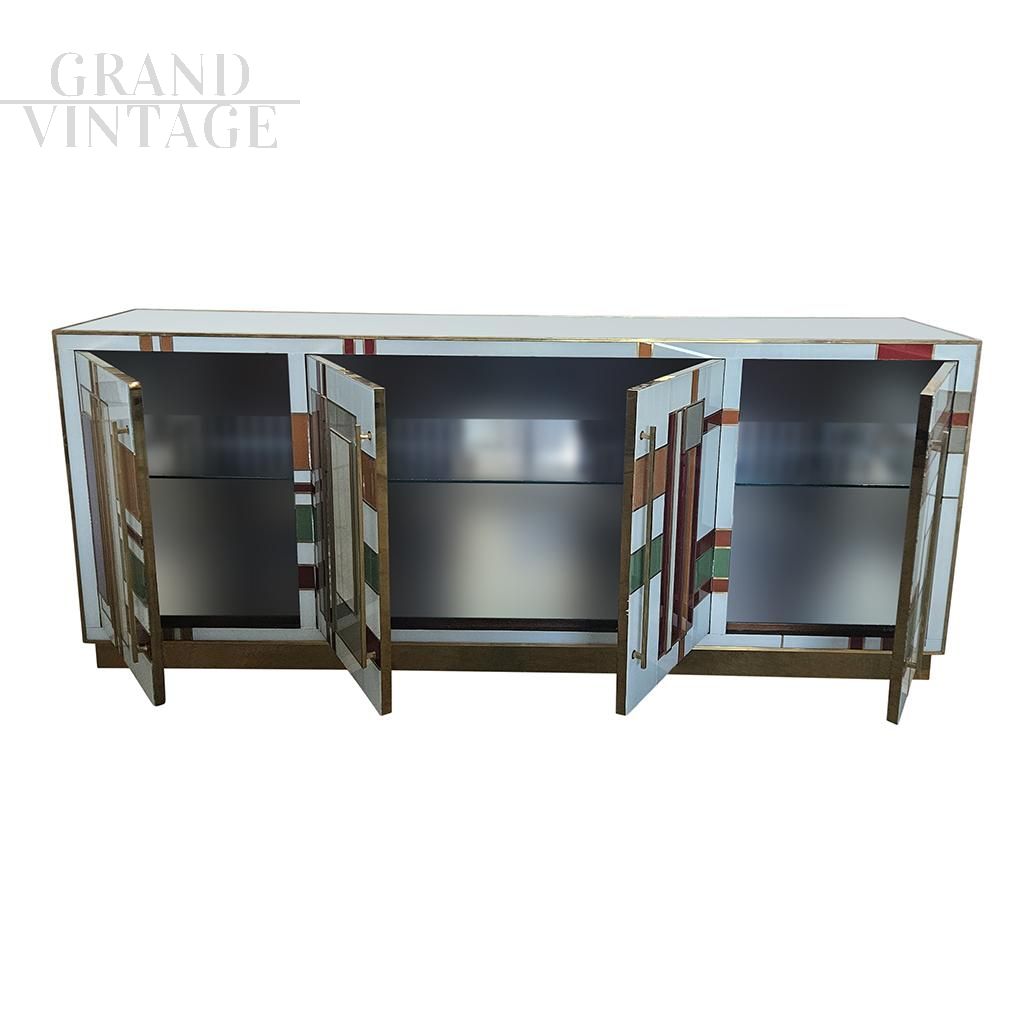 Bellissima credenza a quattro ante, interamente realizzata a mano, con struttura in legno e rivestita in tasselli di vetro colorato. l'interno è interamente specchiato con un ripiano in vetro. La base è di ottone.