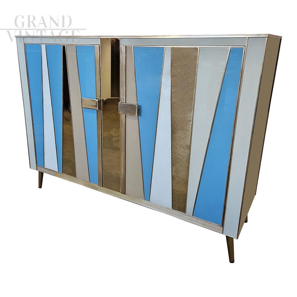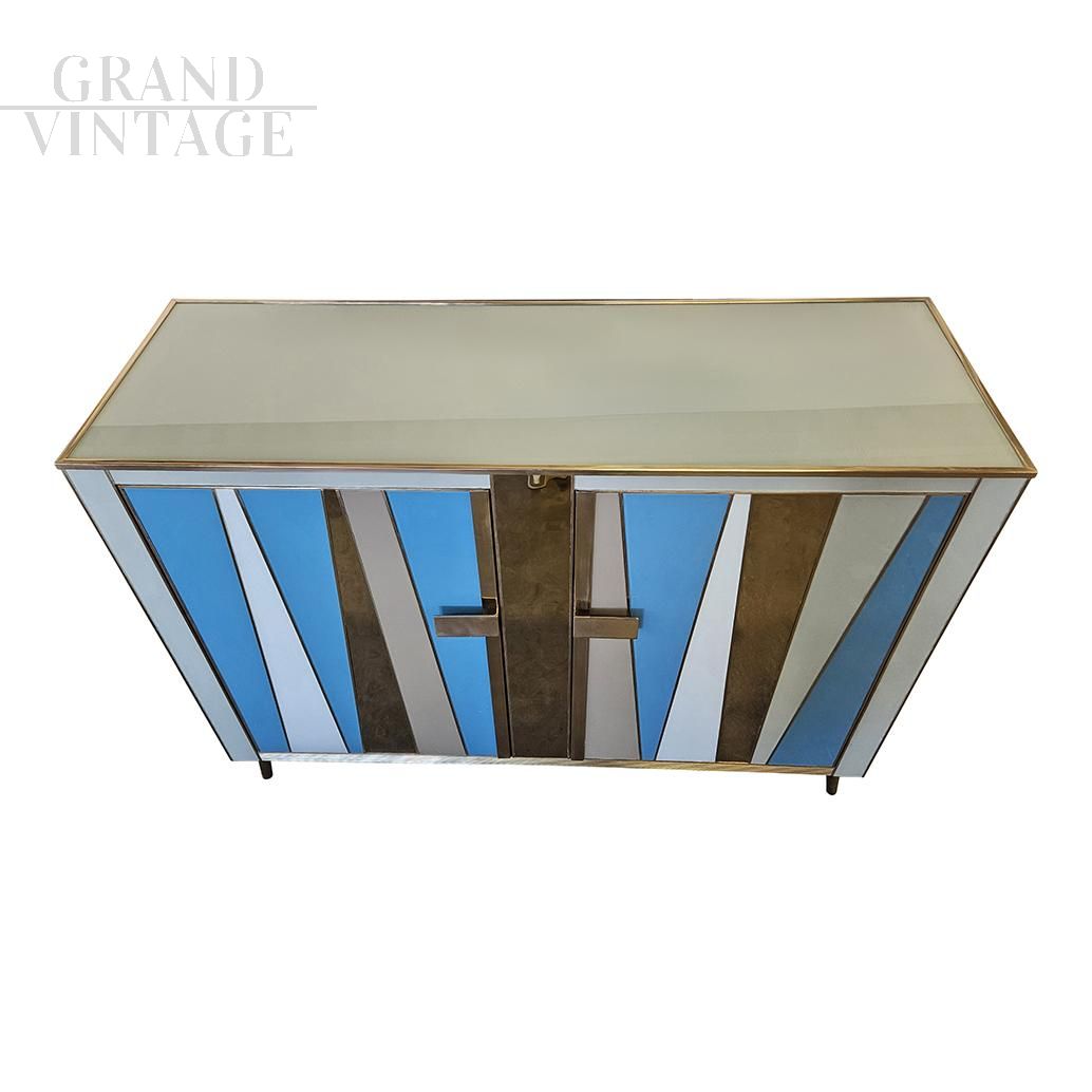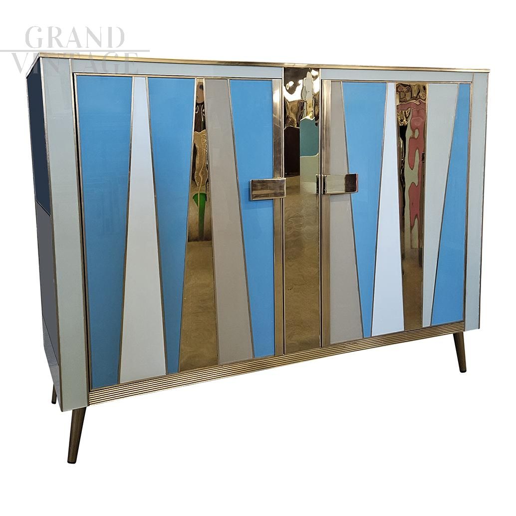 Credenza a due ante con geometrie in vetro azzurro e ottone