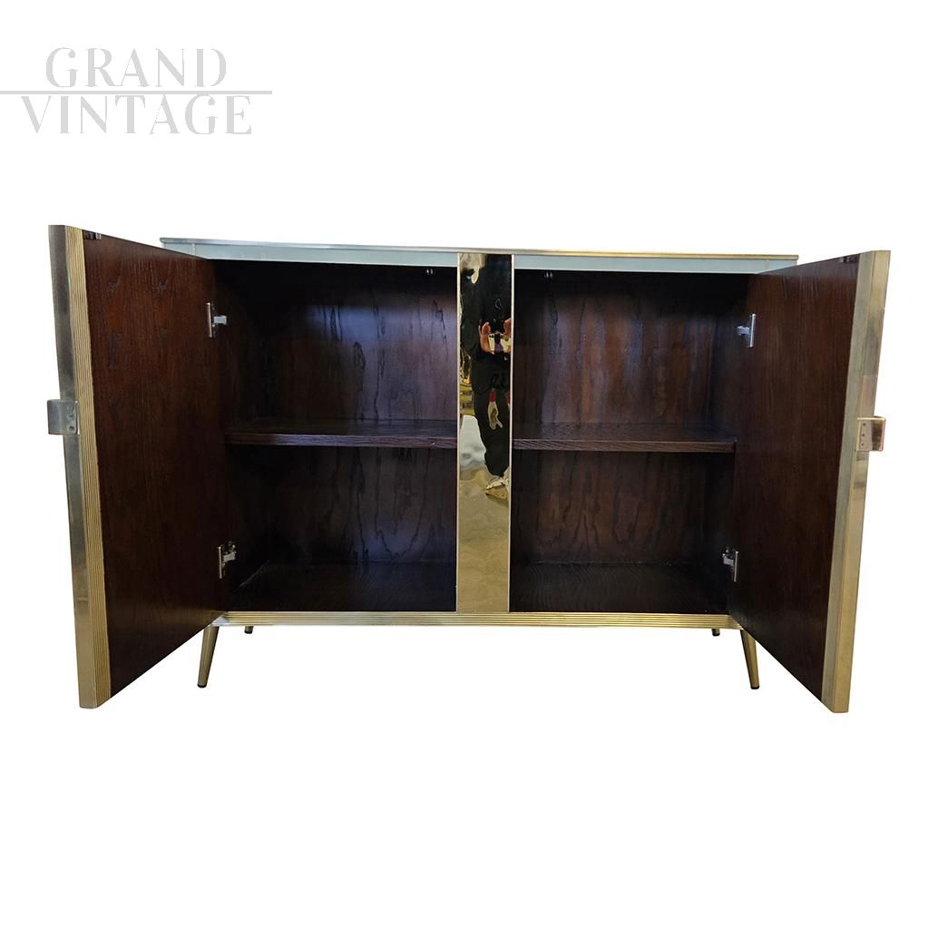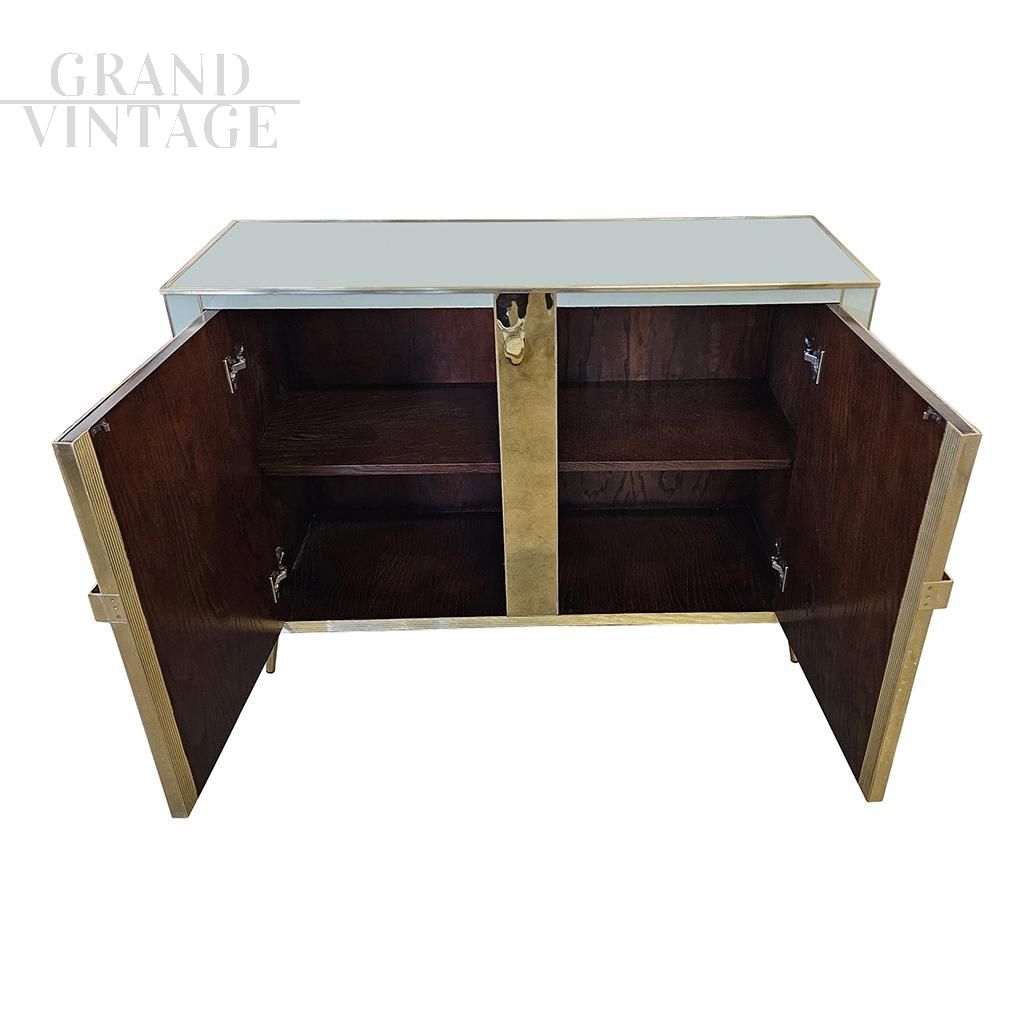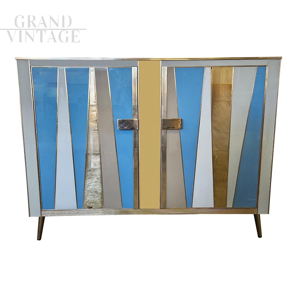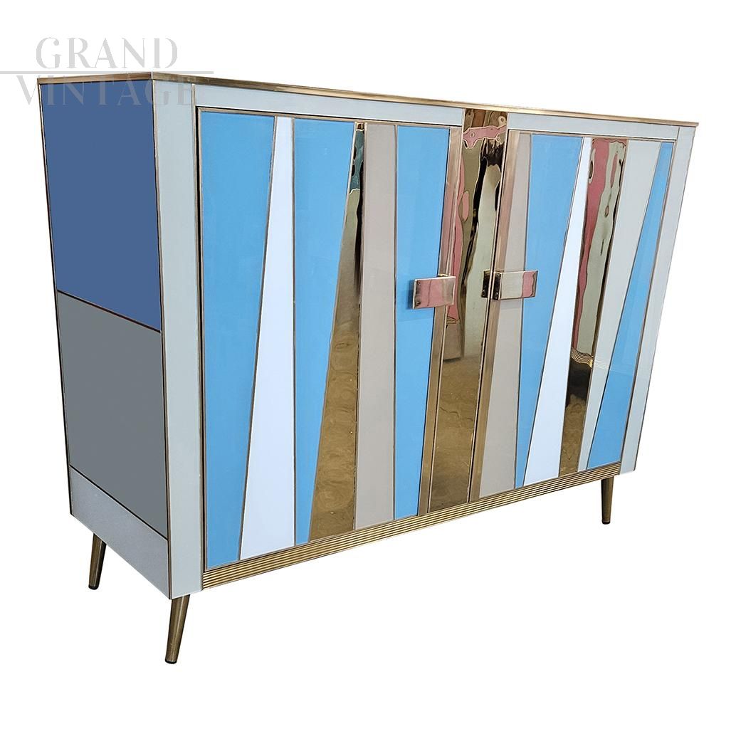 Credenza a due ante con geometrie in vetro azzurro e ottone