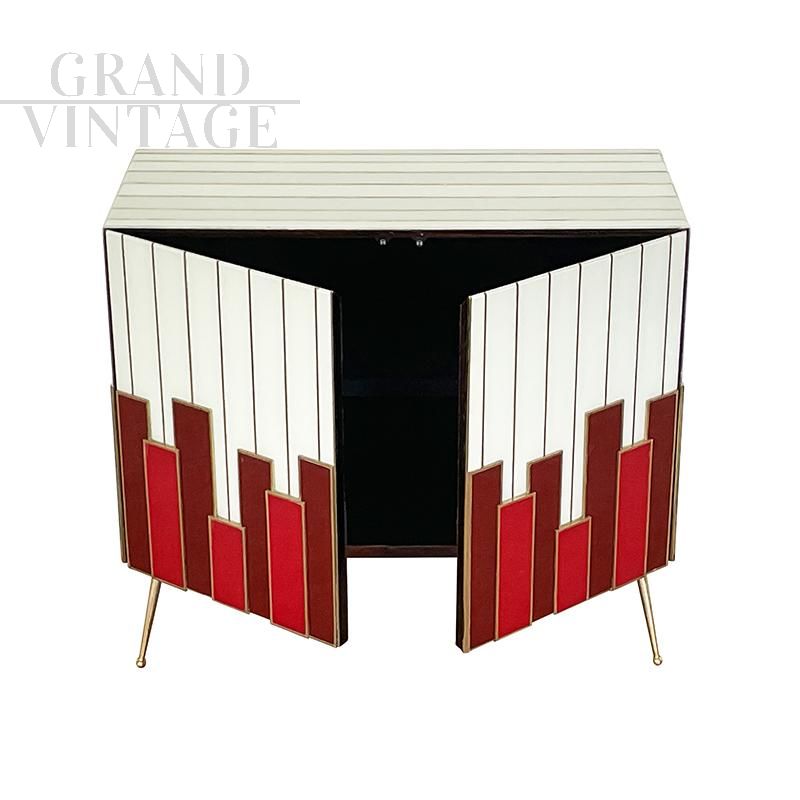 Piccola credenza design interamente realizzata a mano con struttura in legno rivestita in vetro a listoni color bianco, rosso e mattone, ante con apertura push-pull e un ripiano interno. Profili e piedi in ottone.
