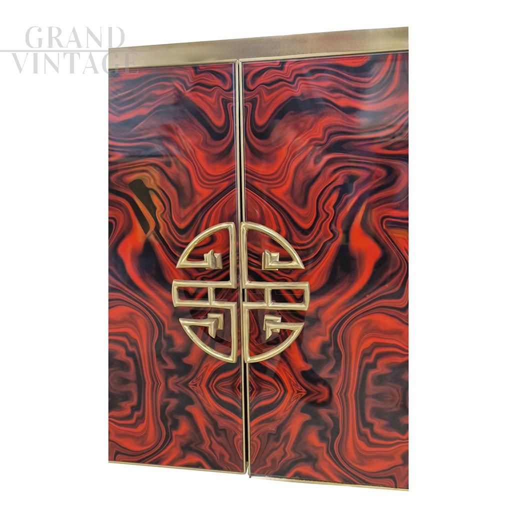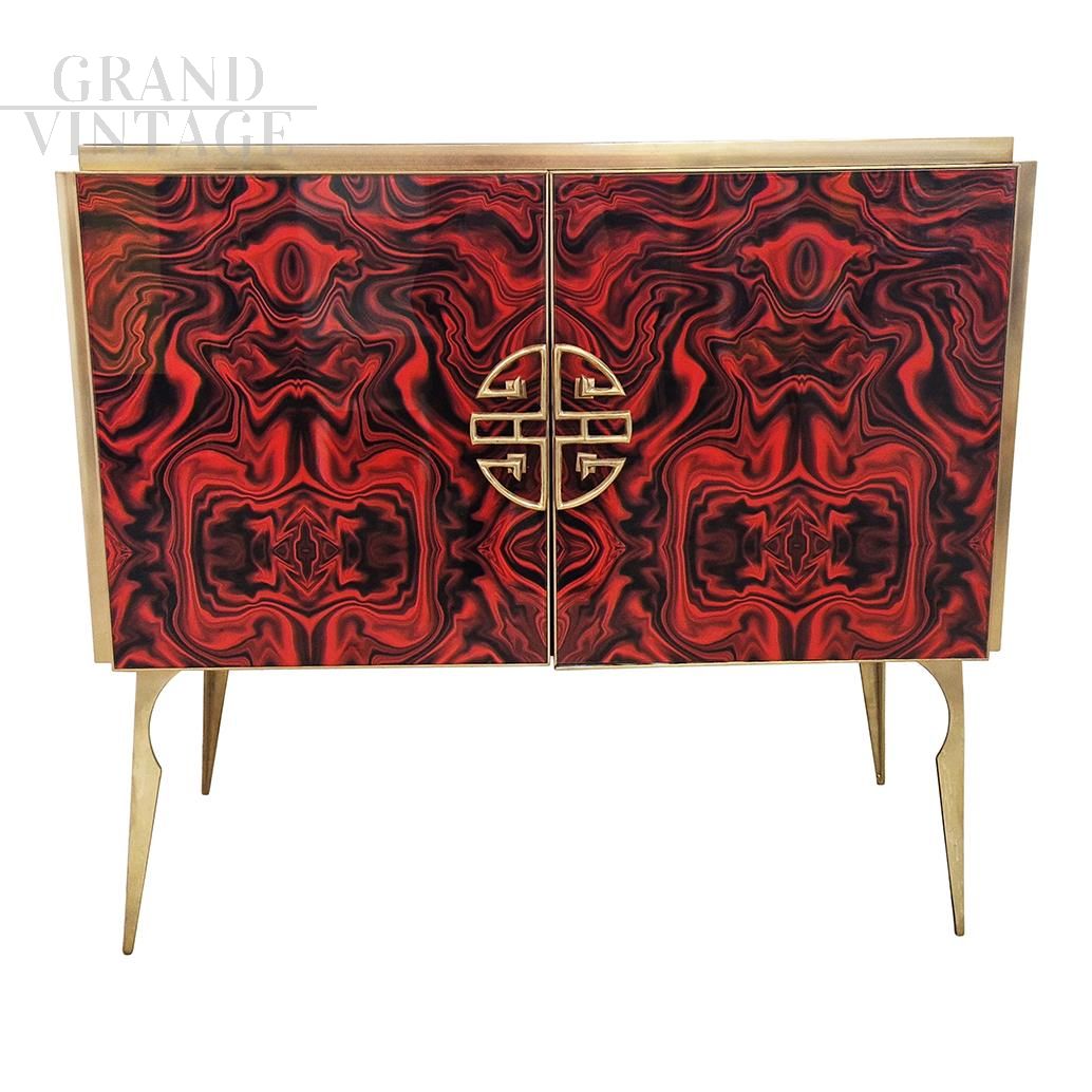 Credenza con due ante, dotata di ripiano interno in legno, interamente realizzata a mano, con struttura in legno rivestita in vetro stampato con motivo astratto rosso e nero; profili, maniglie geometriche e piedi sono in ottone dorato.