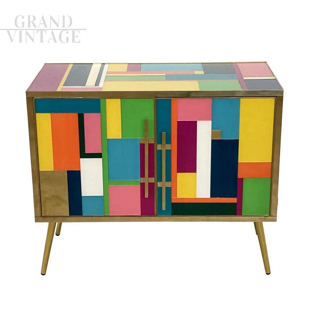 Credenza con due ante, interamente realizzata a mano, struttura in legno e finiture superficiali in vetro di Murano multicolore; profili, maniglie e piedi in ottone dorato.