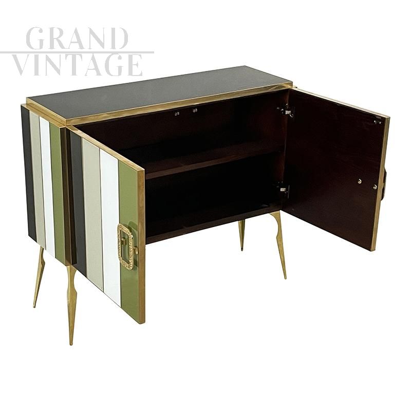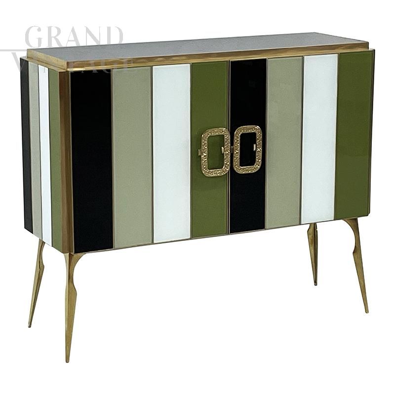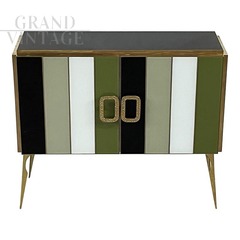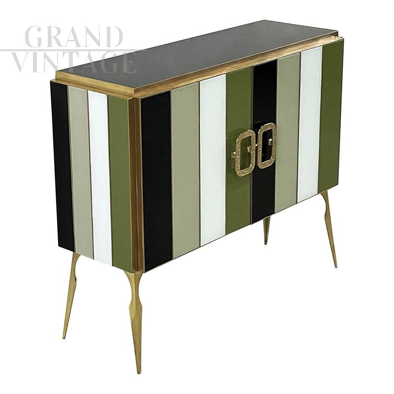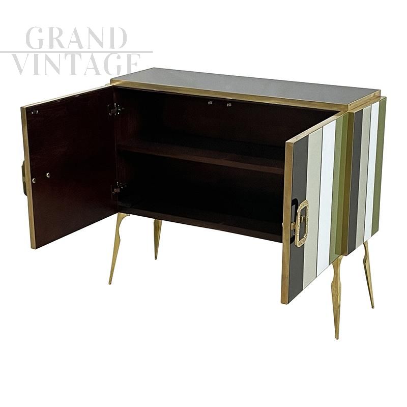 Credenza con due ante, interamente realizzata a mano, con struttura in legno e rivestimento a fasce verticali in vetro di Murano nei toni del verde kaki; profili, maniglie e piedi in ottone dorato.