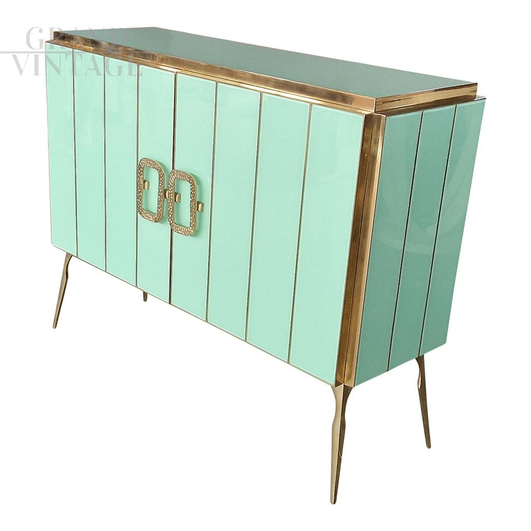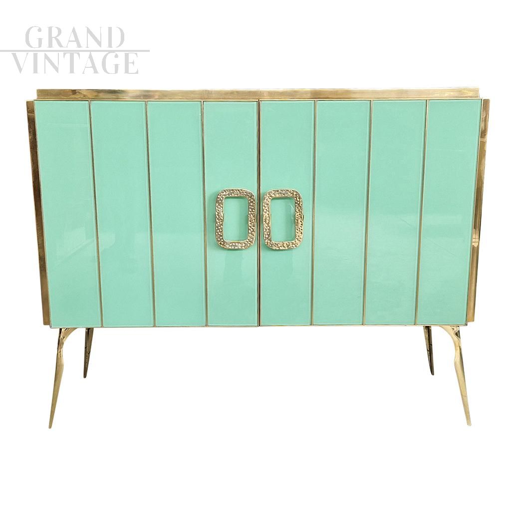 Credenza vintage a due ante con struttura in legno e finiture superficiali in vetro di Murano azzurro acqua opalino, tonalità Tiffany, con profili, maniglie e gambe in ottone dorato, interamente realizzata a mano, dotata di ripiano interno in legno.