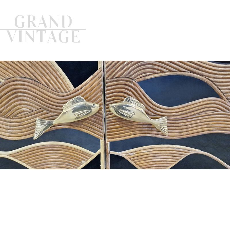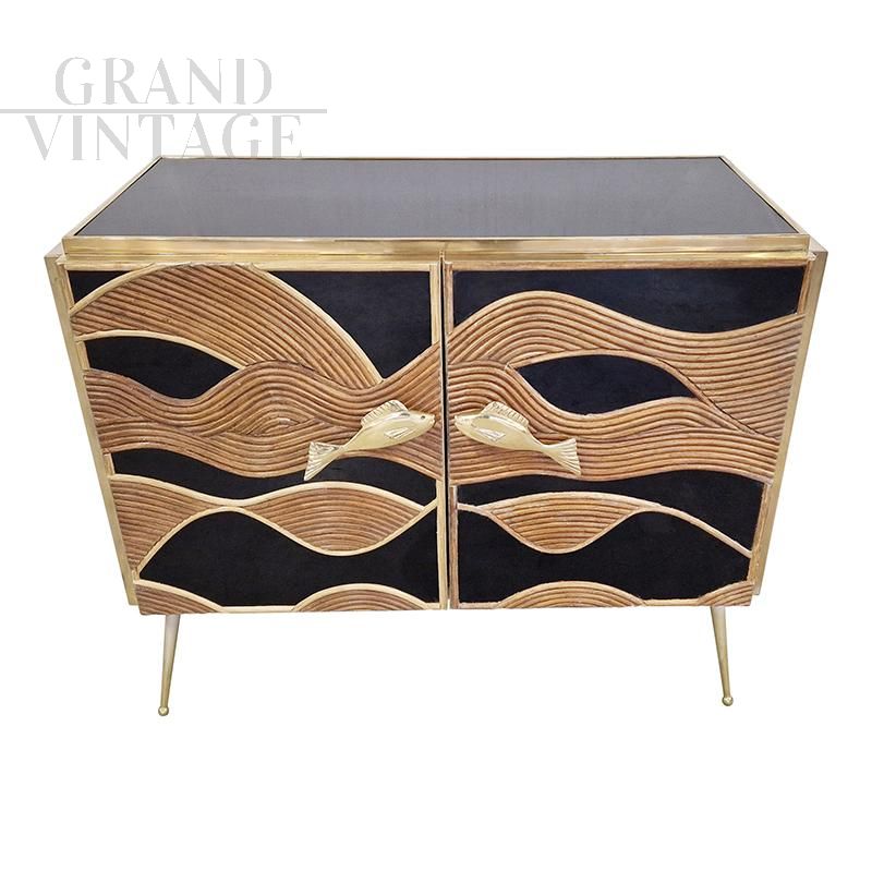 Credenza a due ante interamente realizzata a mano, con struttura in legno rivestita in vetro nero e bamboo, ripiano in vetro, interno a specchio, profili e piedi in ottone dorato, maniglie dorate a forma di pesce.