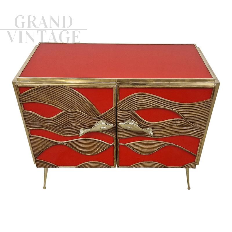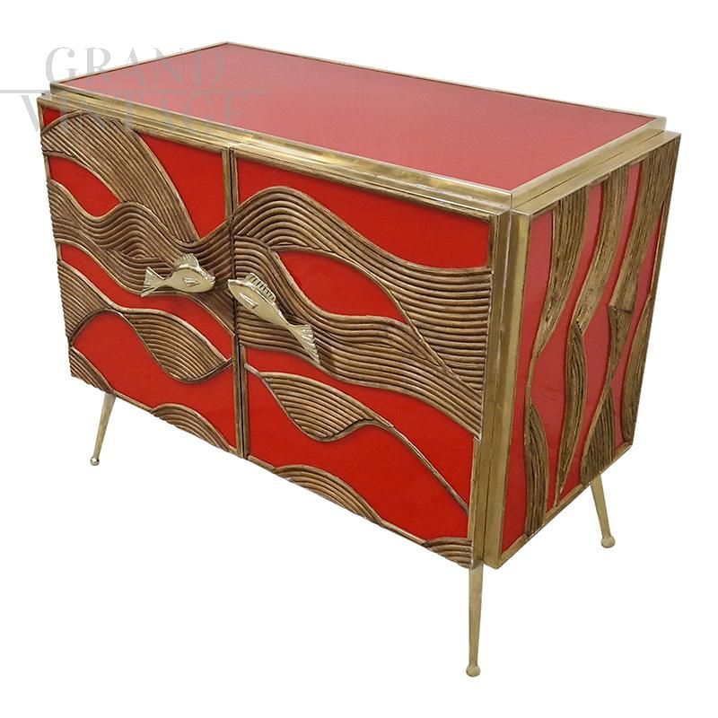 Credenza a due ante interamente realizzata a mano, con struttura in legno rivestita in vetro rosso e bamboo, ripiano in vetro, interno a specchio, profili e piedi in ottone dorato, maniglie dorate a forma di pesce.
