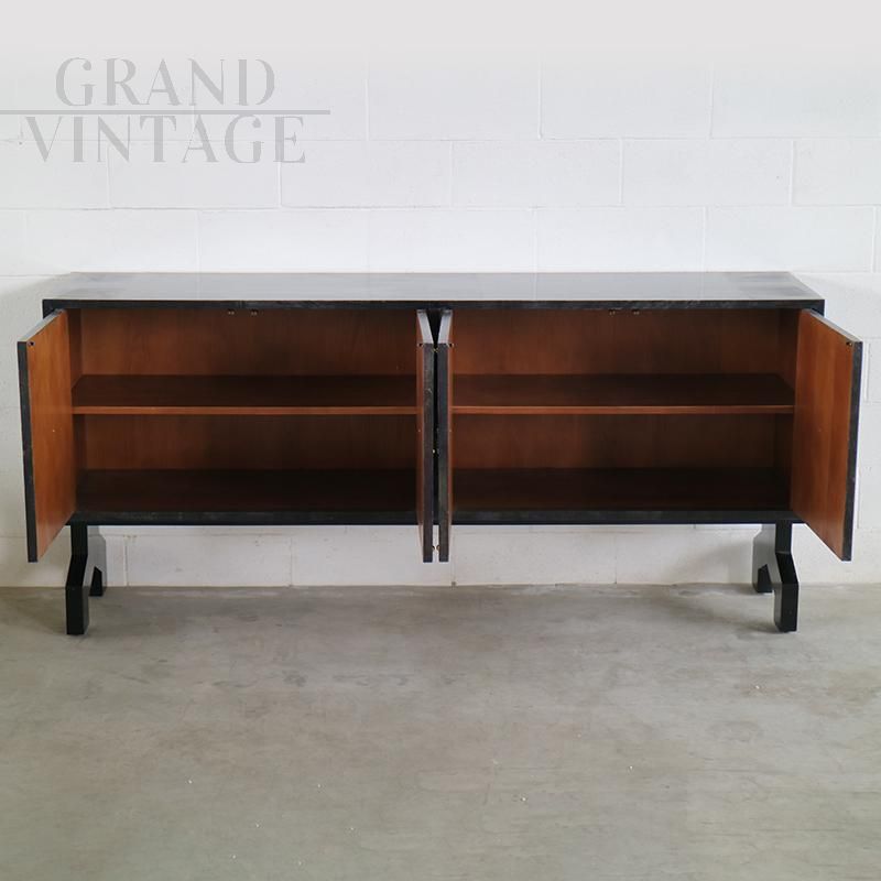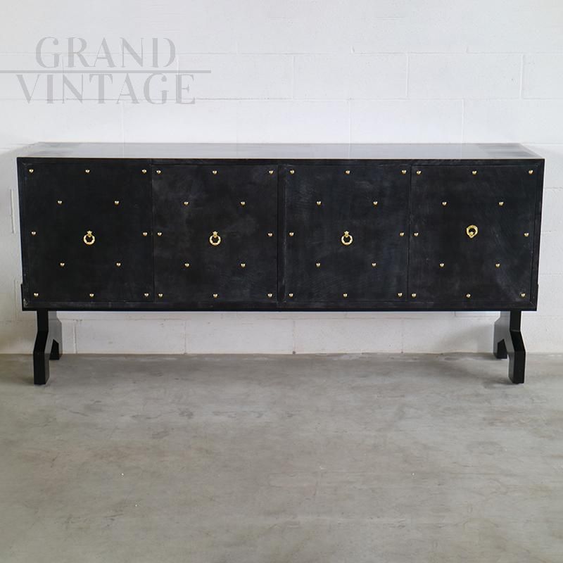 Credenza con quattro ante, completamente realizzata a mano, struttura in legno rivestita con pergamena nera, base con piedi laccati neri e maniglie dorate.