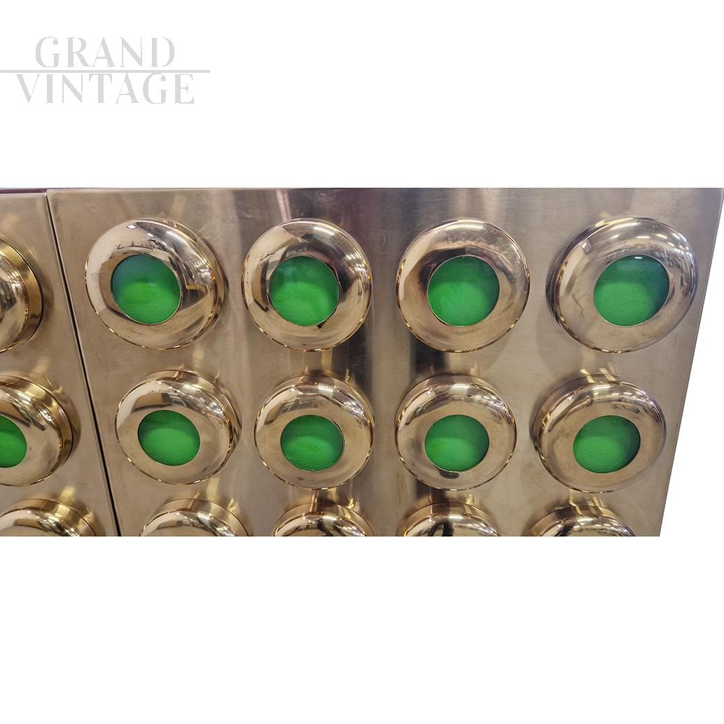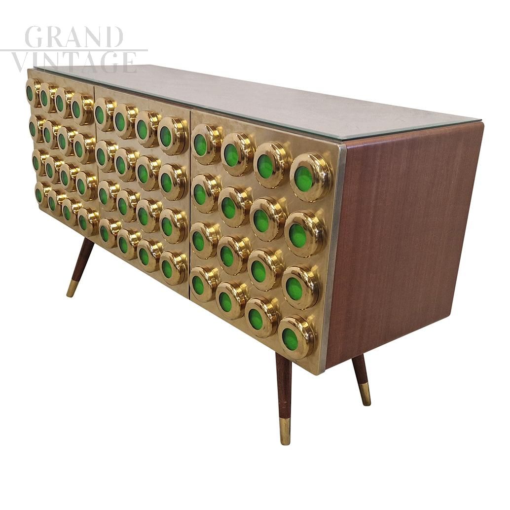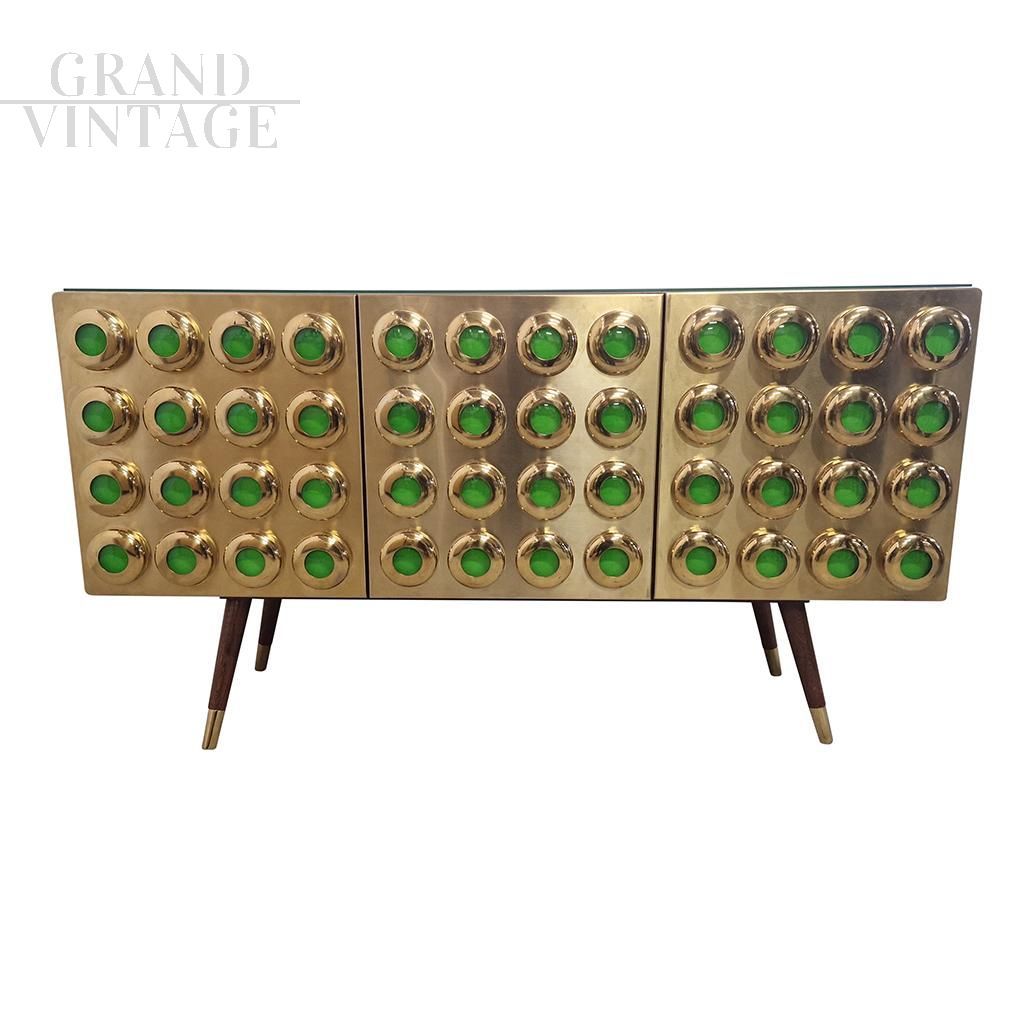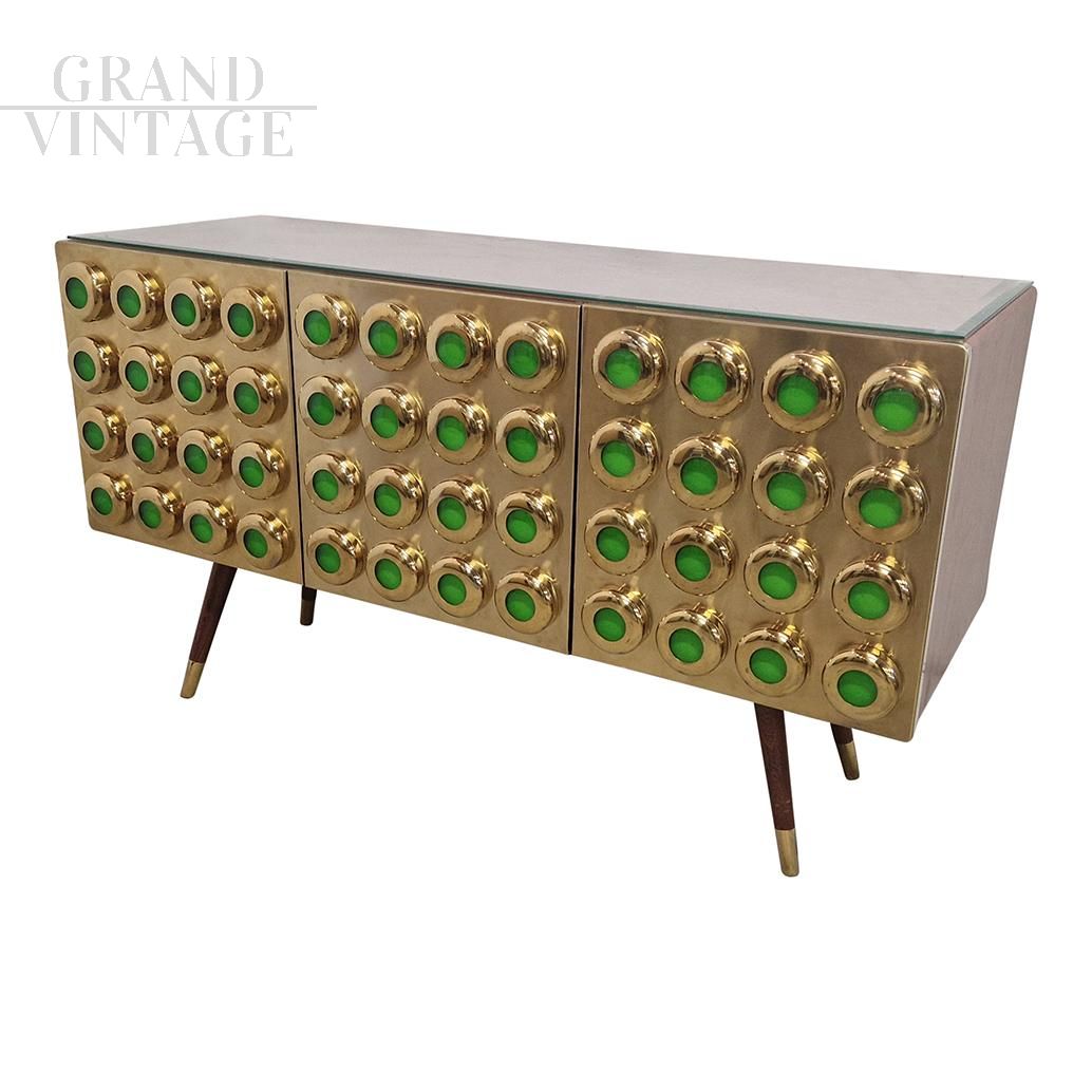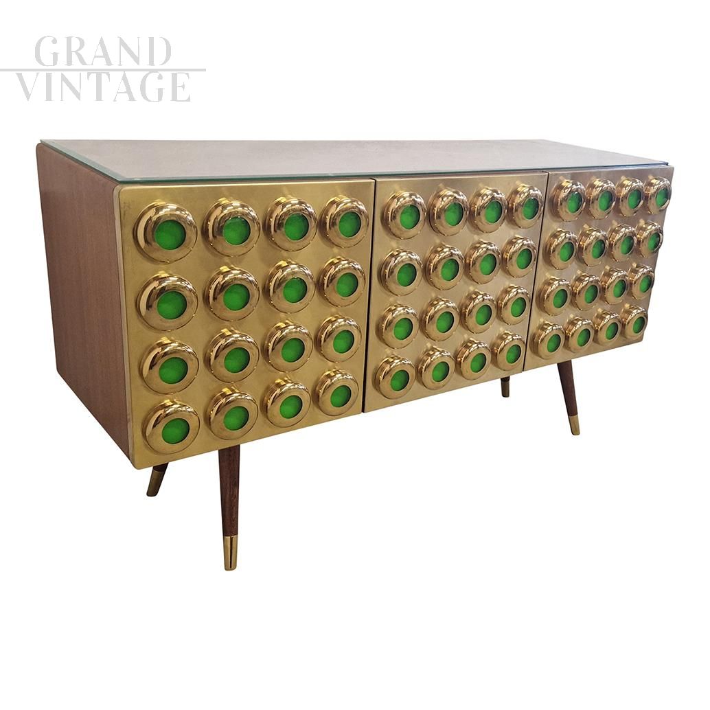 Credenza a tre ante in ottone con inserti circolari in vetro verde