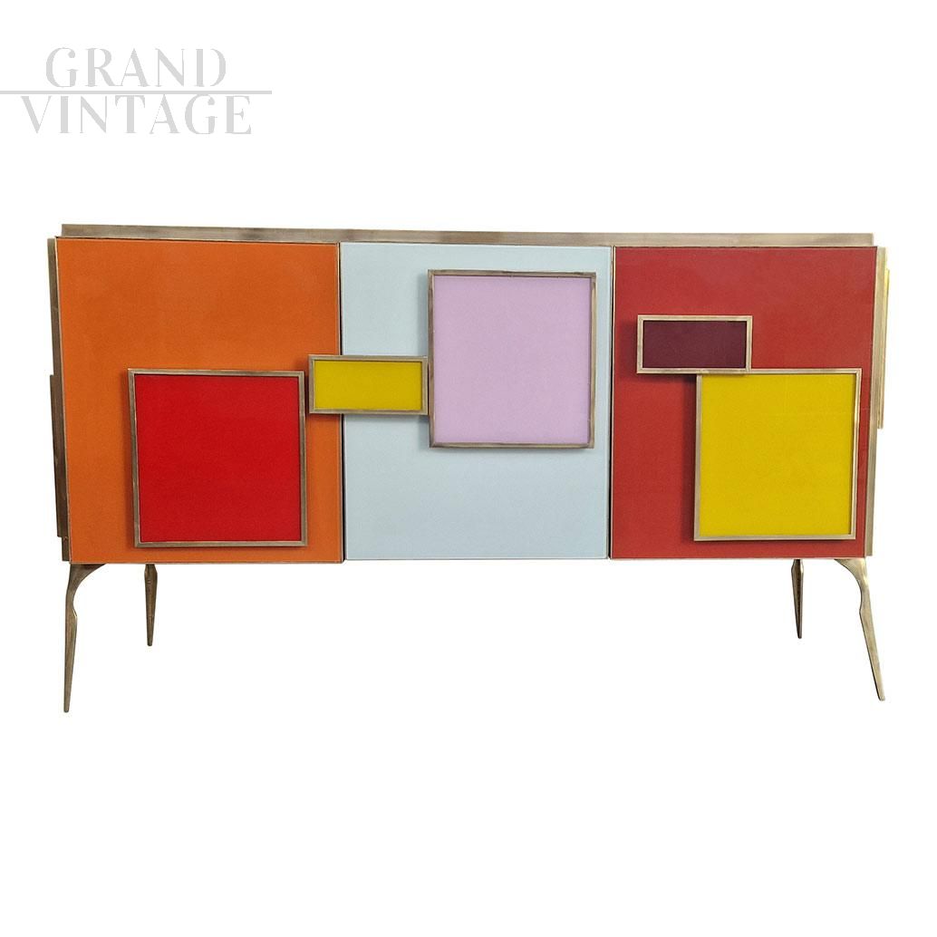 Credenza in stile vintage a tre ante, interamente realizzata a mano, con struttura in legno e finiture superficiali in vetro colorato; profili, maniglie e piedi in ottone dorato. Un ripiano interno. Maniglie retroilluminate a led.