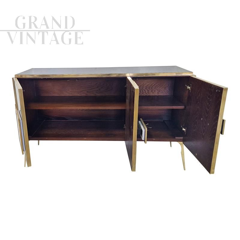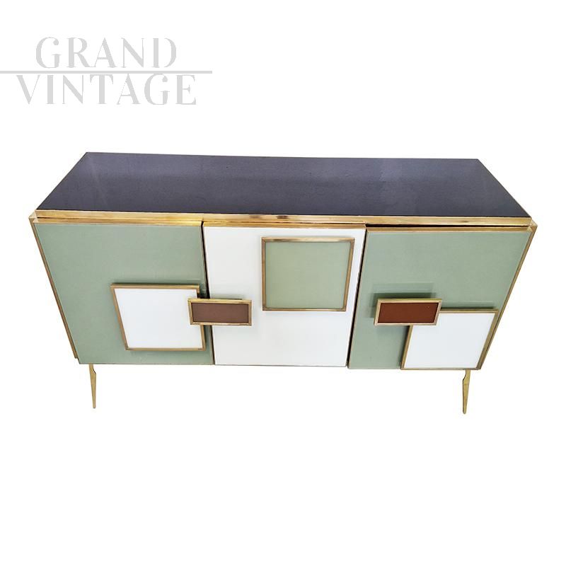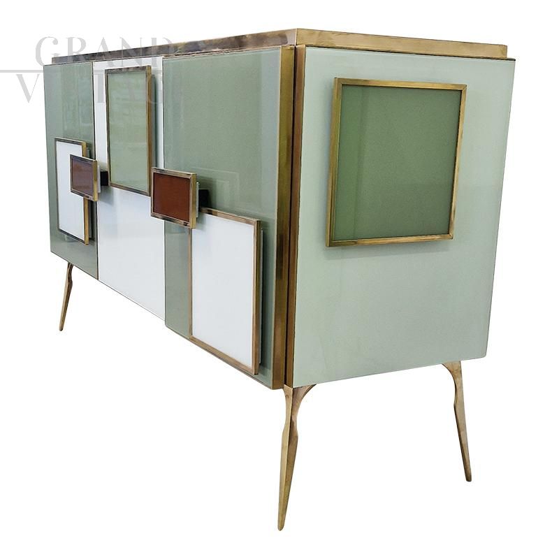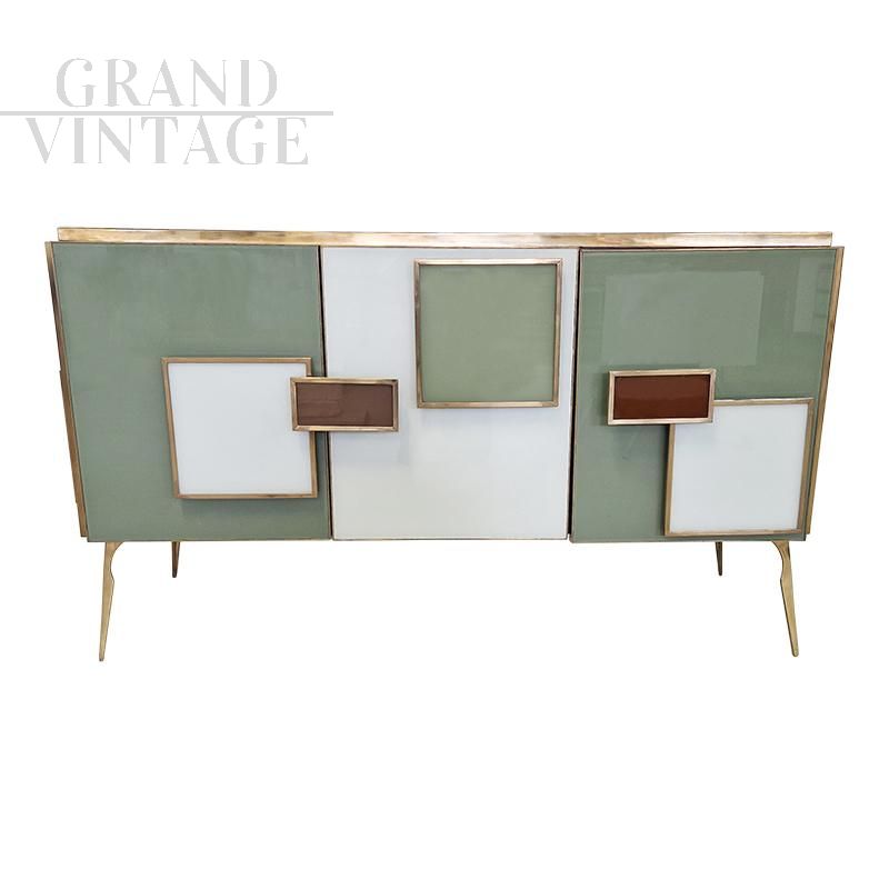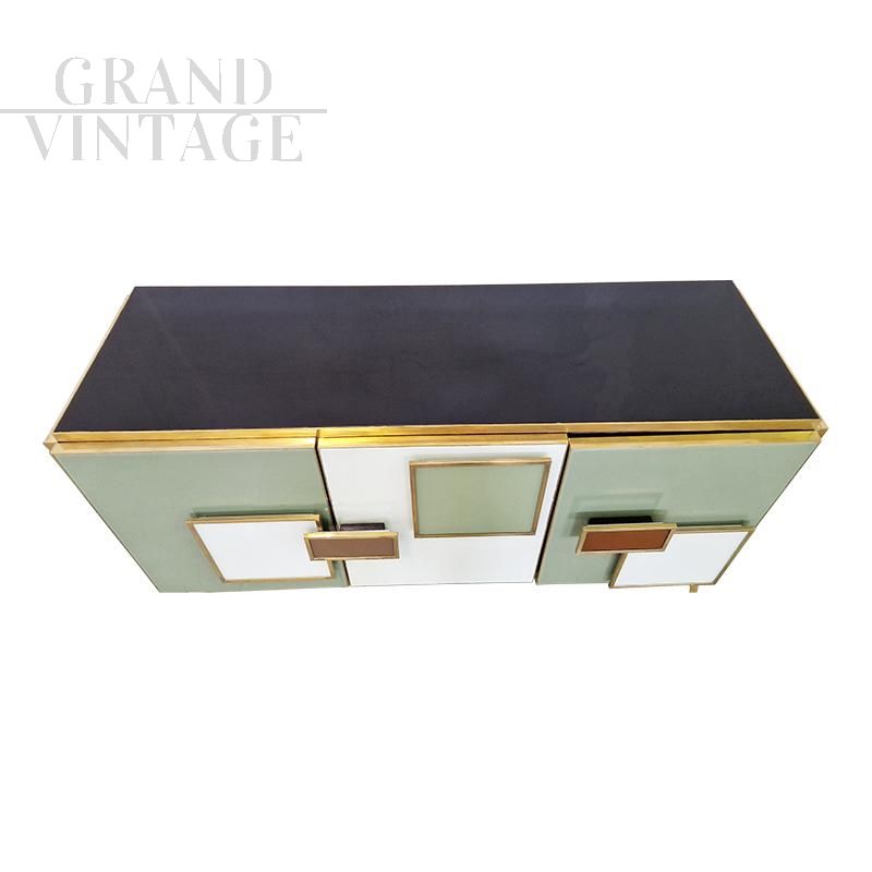 Credenza a tre ante interamente realizzata a mano, con struttura in legno rivestita in vetro bianco e verde salvia, profili e piedi in ottone dorato, maniglie retro illuminate con strisce a led azionabili con apposito telecomando, dotata di ripiano interno.