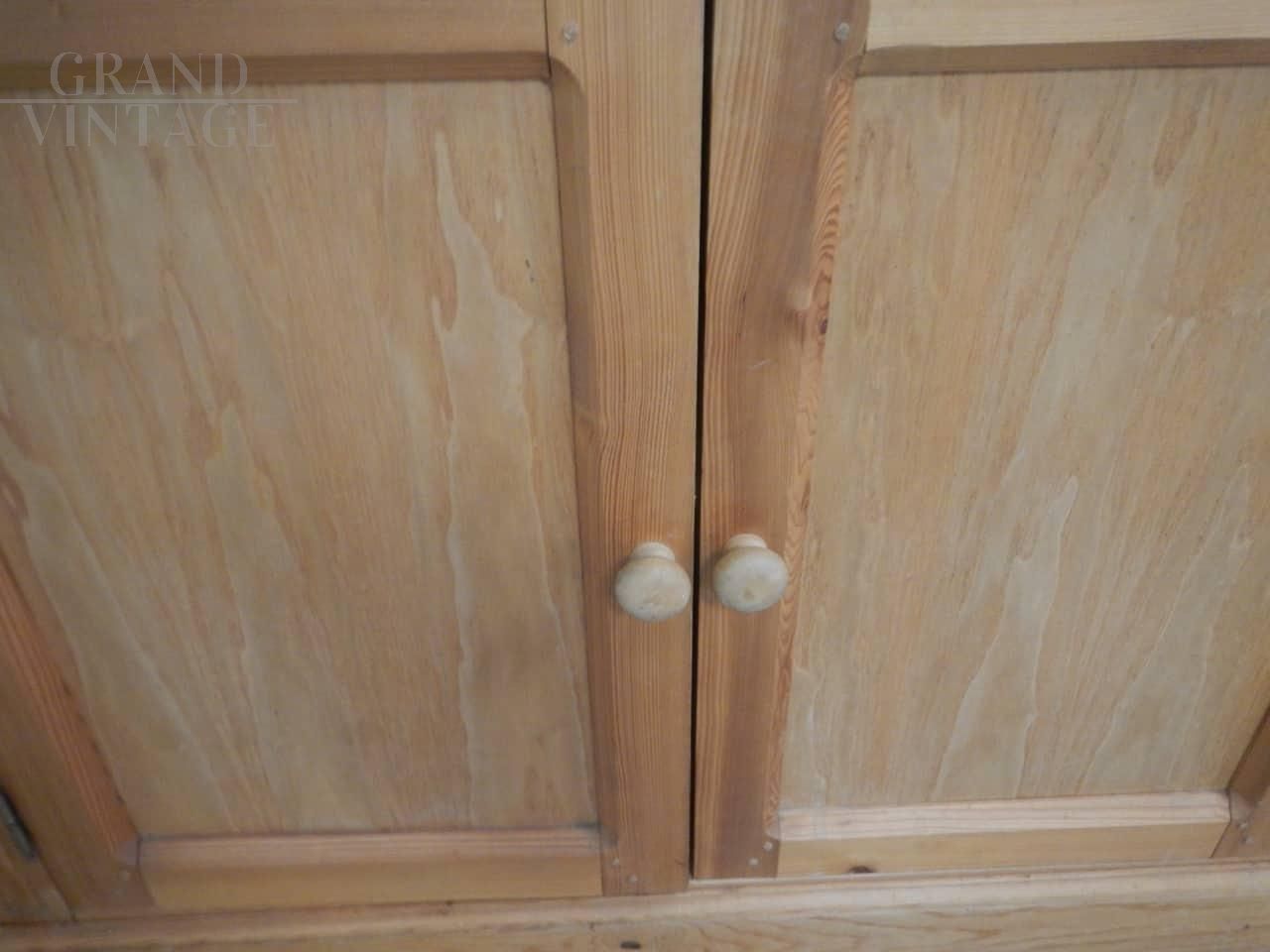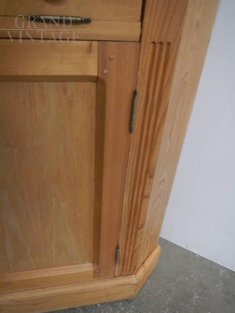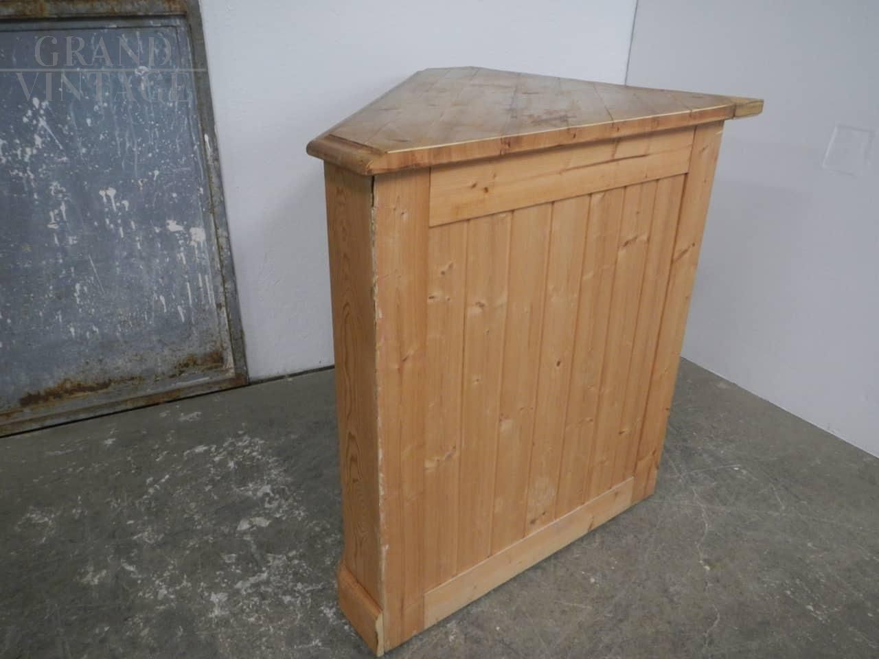 Credenza angolare cantonale rustica in abete naturale con una ripiano interno e uno spazio sotto piano di cm 12 di altezza. Lo spazio tra i ripiani e di cm 28 / 31 cm. L’angolo misura cm 90 x 90 cm