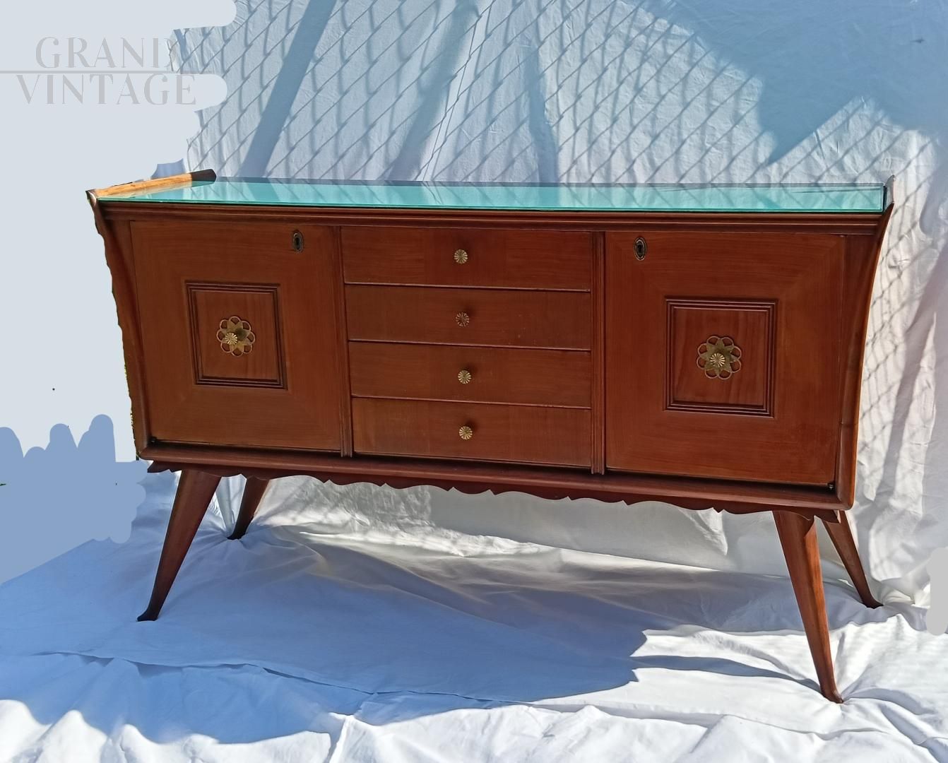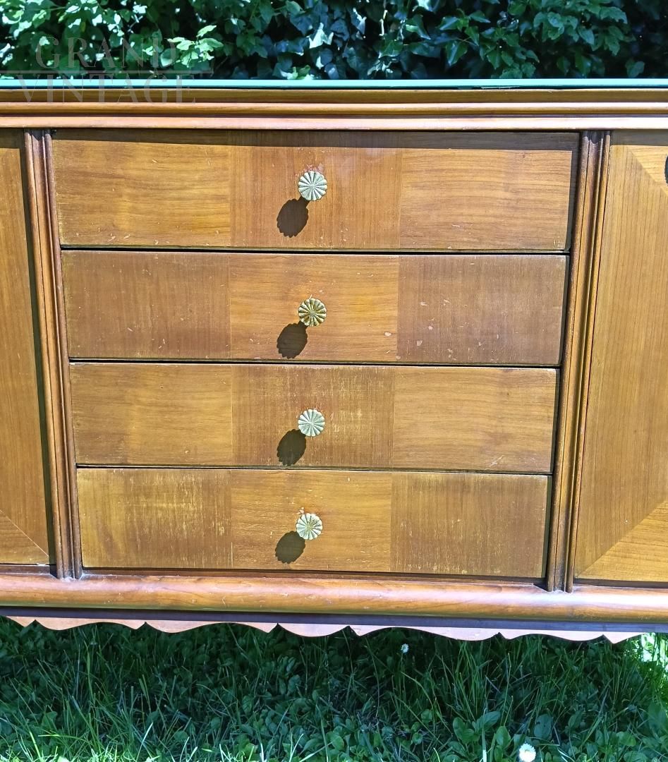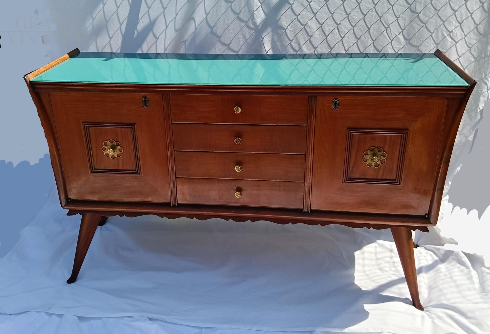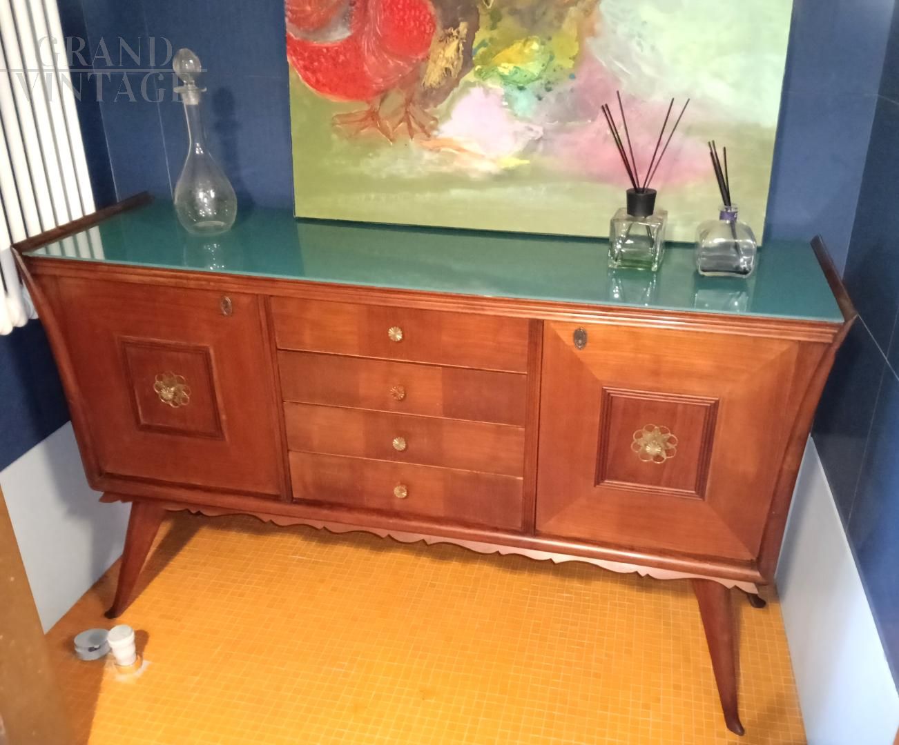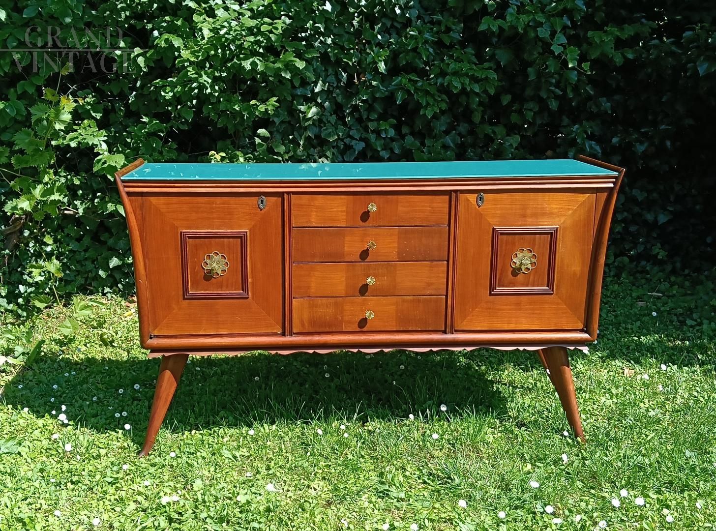 Credenza italiana anni '50 con disegno geometrico ed esecuzione degli intagli molto curati e dettagliati. La struttura è in legno di olmo tamburato, il piano in vetro retro laccato azzurro - verde. I piedi sono in legno massiccio, e son sormontati de festoni decorativi sotto la base. I fianchi sono finemente svasati. La credenza è in ottimo stato, è stata smontata e restaurata, non ha difetti evidenti ma porta qualche naturale segno d'uso. Maniglie in ottone massiccio, la chiave è mancante, la chiusura delle ante è a calamita.