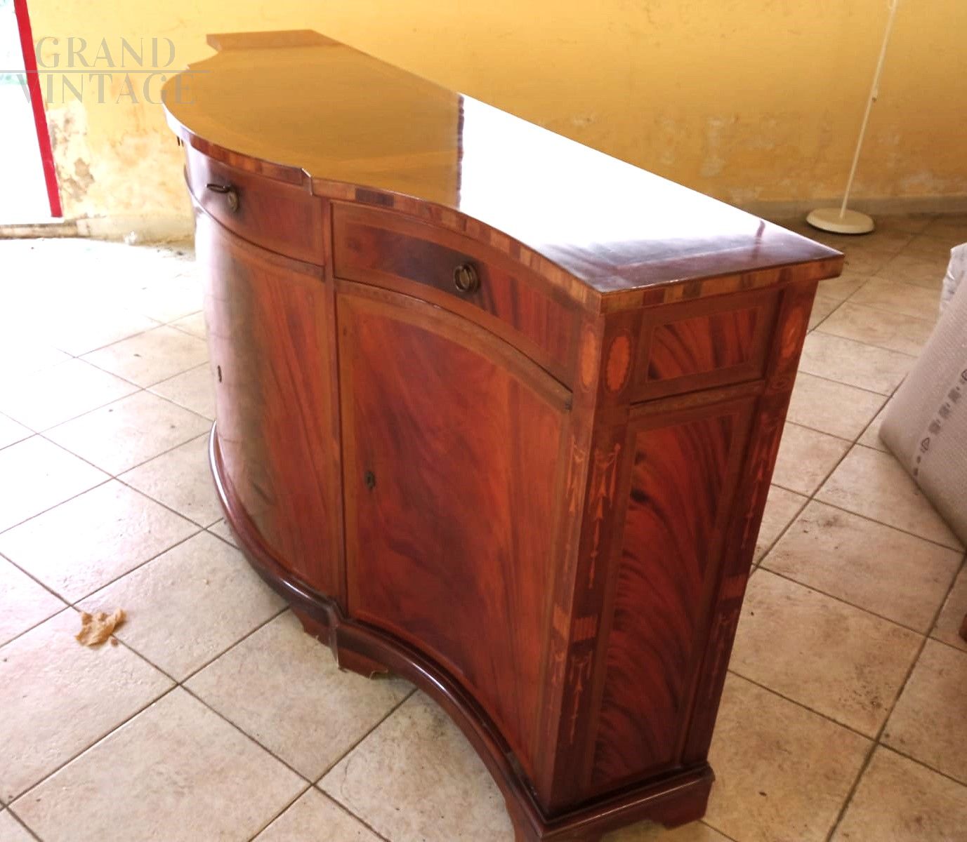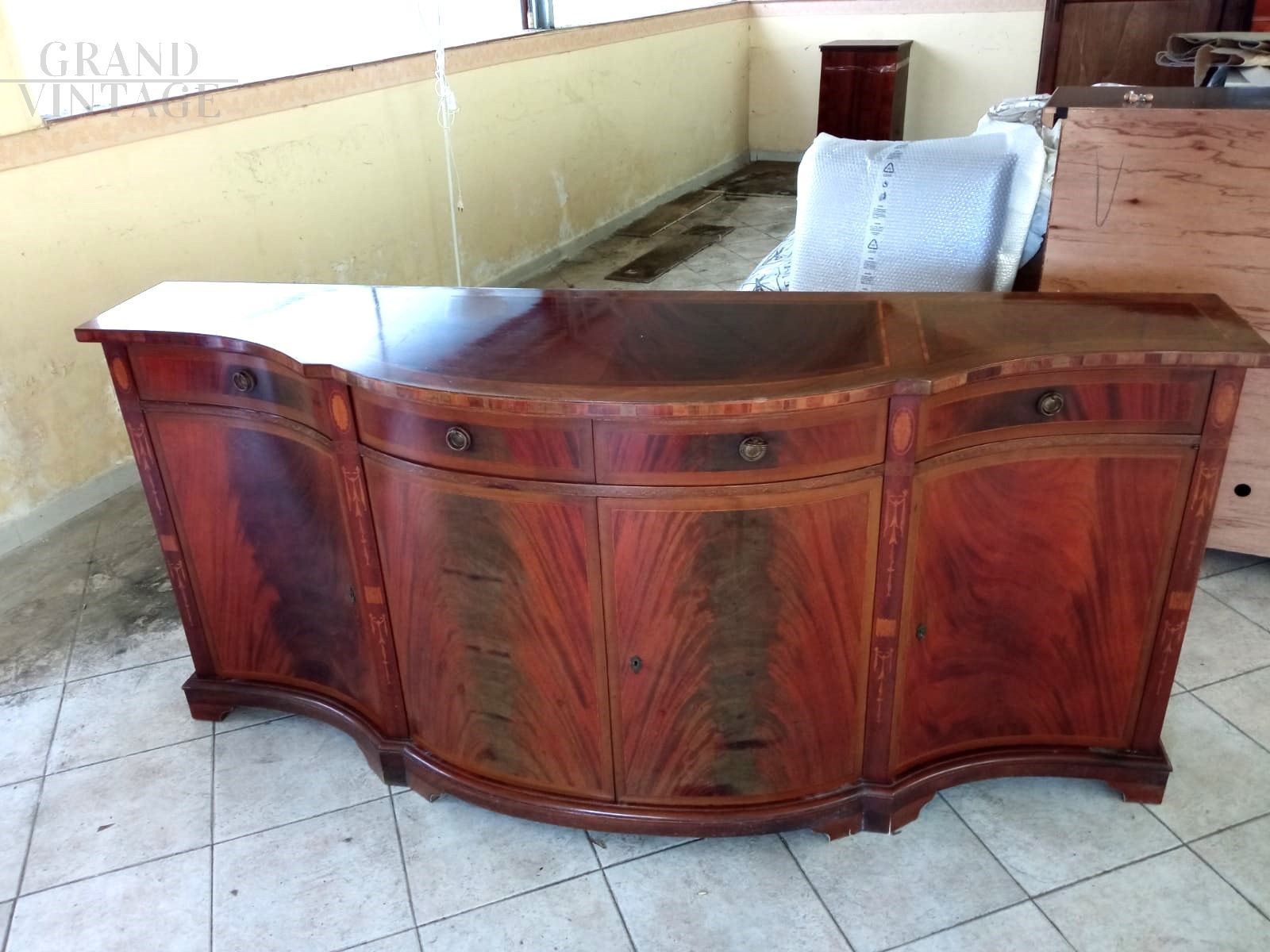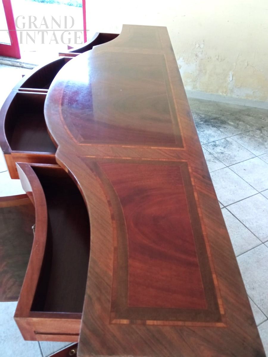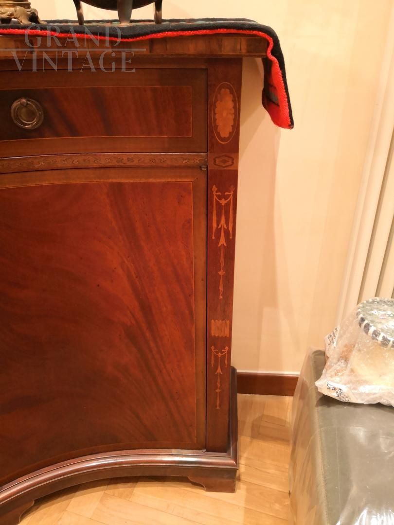 Elegante e sobria credenza in stile antico in legno intarsiato, con fronte mosso, quattro ante e quattro cassettini, della fine degli anni '70 - inizio anni '80 proveniente da un importante negozio di arredi napoletano, in ottimo stato d'uso.