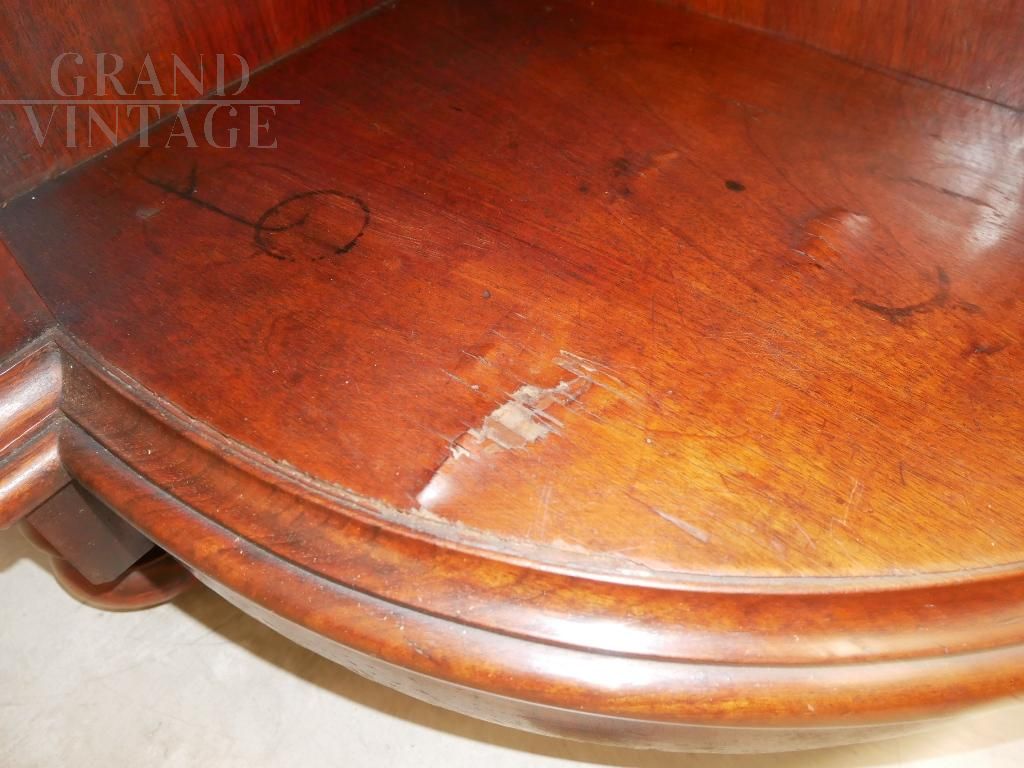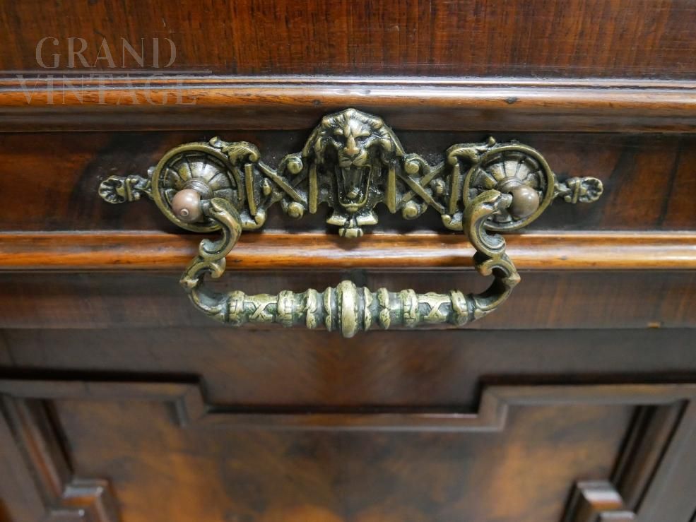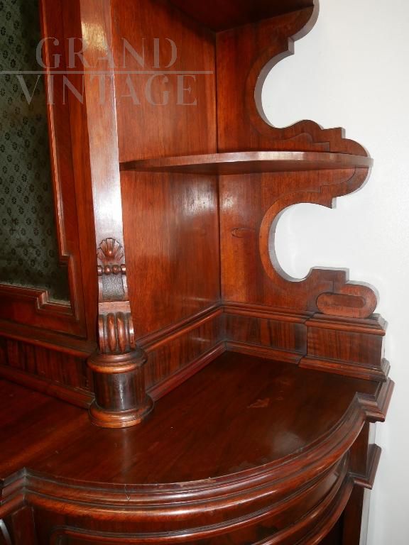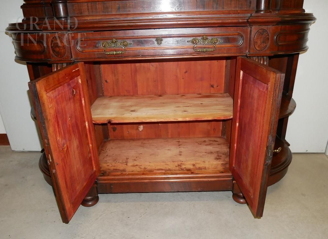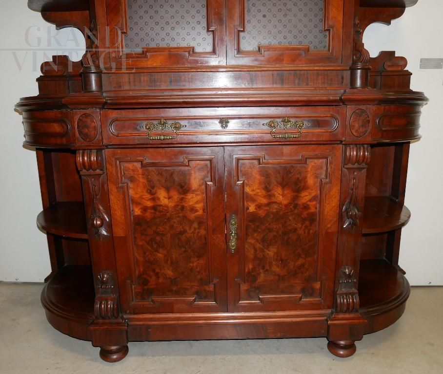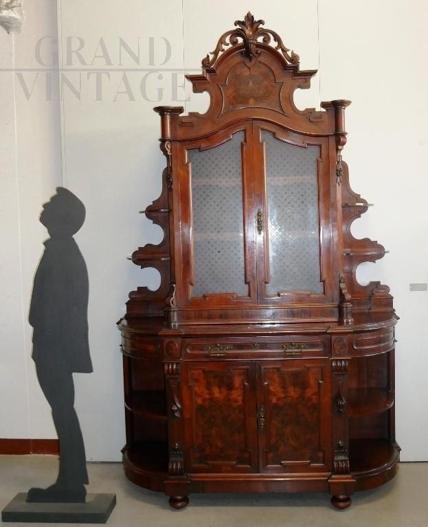 Credenza antica con alzata a vetrina, in noce massello e impiallacciata. Epoca fine del 1800. Provenienza nord Italia. Mobile di ottima ebanisteria costruito con parti in legno massello, parti impiallacciate a lisca di pesce, parti radicate e parti intagliate. Grandi dimensioni, misura in altezza con fregio cm. 280 Lunga cm. 75 profonda cm. 58. Base con ante centrali, cassetto sopra, fianchi stondati con ripiani a giorno, alzata con due ante a vetrina centrali e con due ripiani dentro, angoli stondati a giorno con ripiani. Sfarzoso cornicione sagomato con fregi intagliati al centro. Il mobile si presenta in ottime condizioni generali, totalmente originale in patina, non restaurato di recente. Presenta piccole mancanze e segni del tempo nella vernice. Completo di serrature, chiavi, bocchette e maniglie.