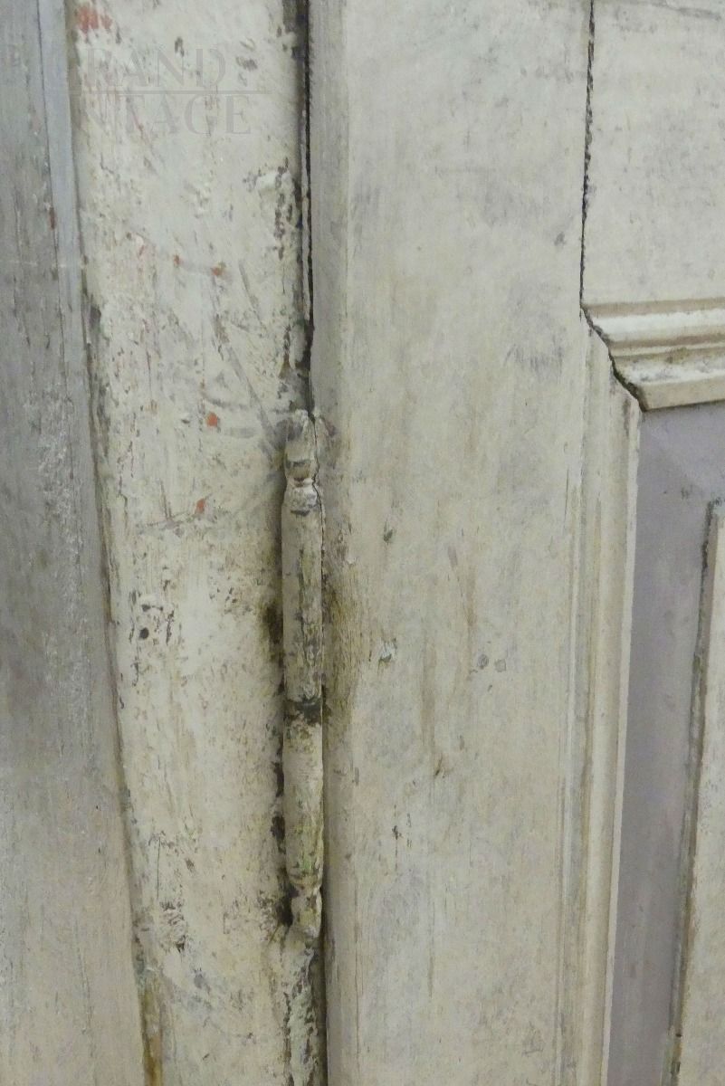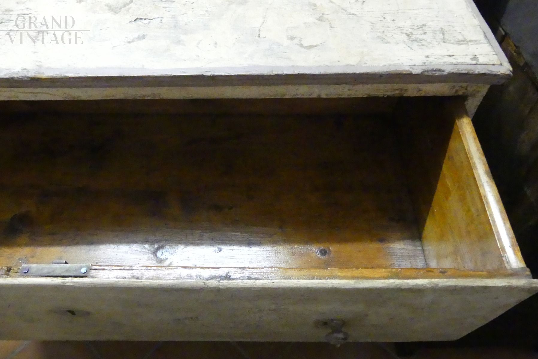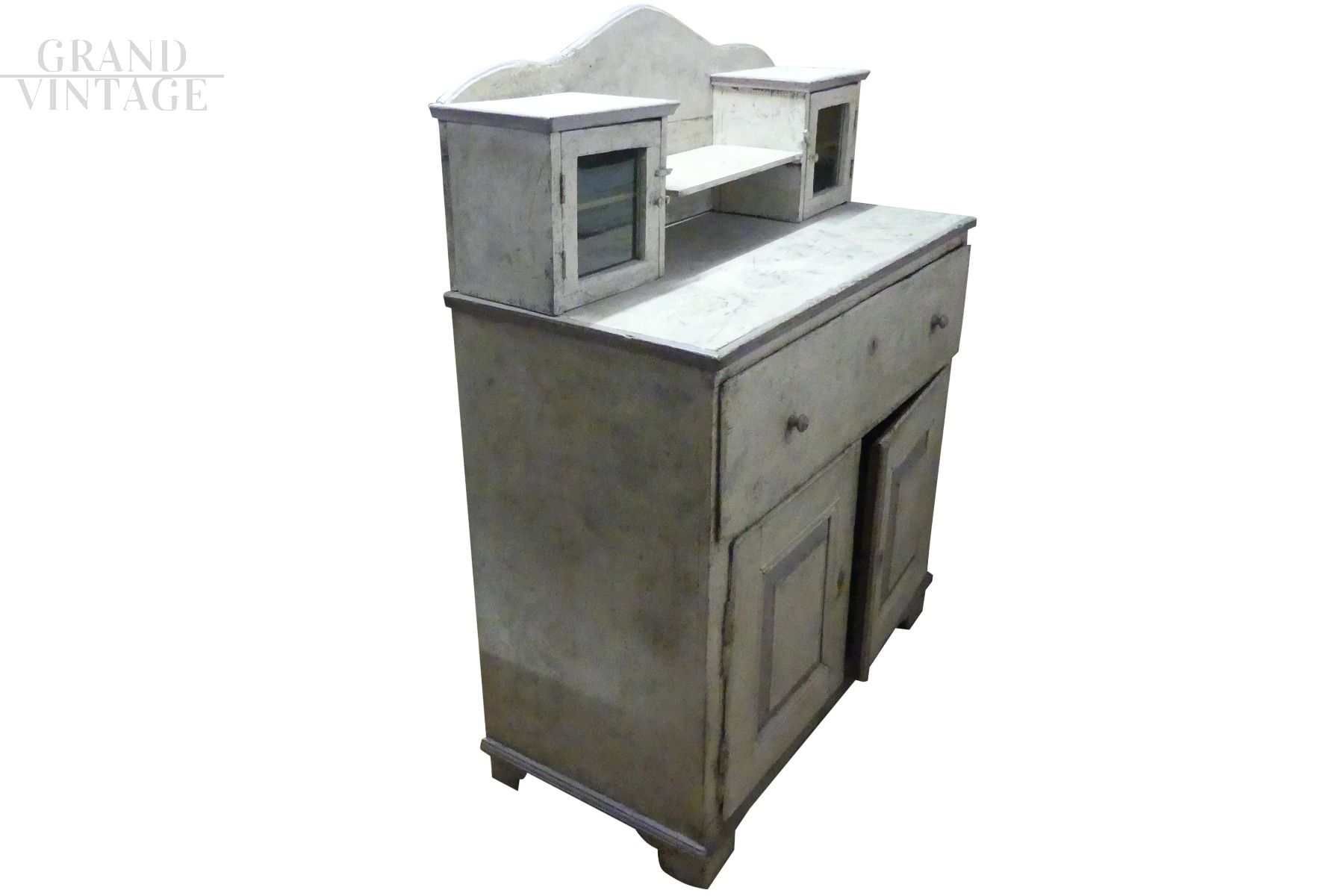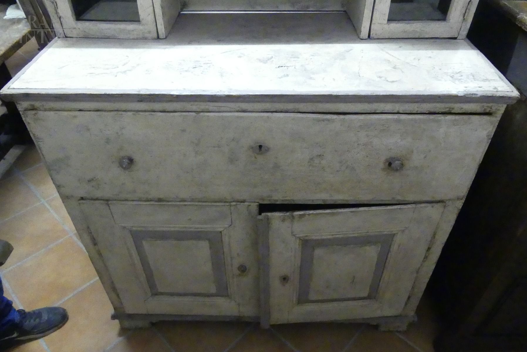 Credenza antica da cucina con alzata del periodo 1870 - 1880, di provenienza Lombarda, costruita in legno di abete in pittura bianca, di gusto shabby chic provenzale, perfetta da inserire in un ambiente in stile country. Il mobile presenta i naturali segni del tempo, come da foto.