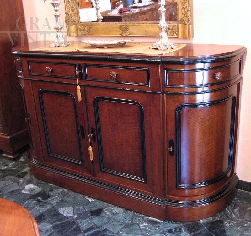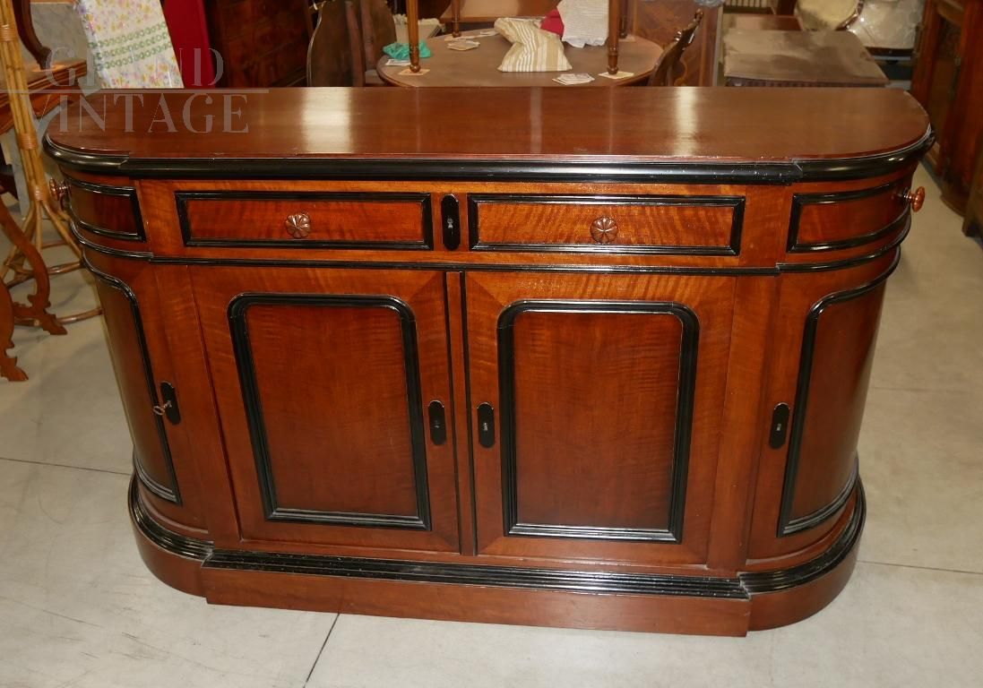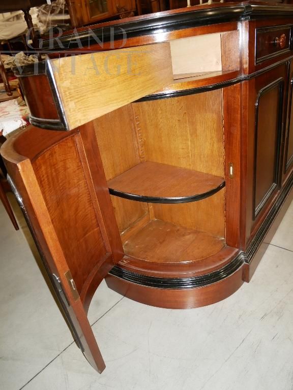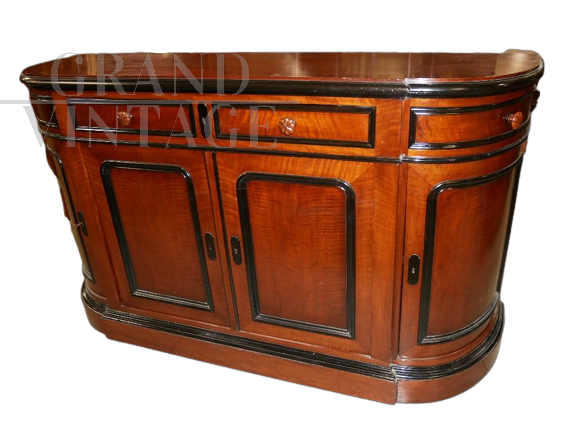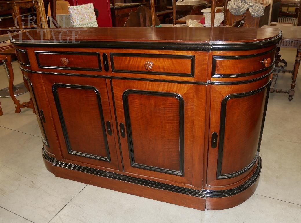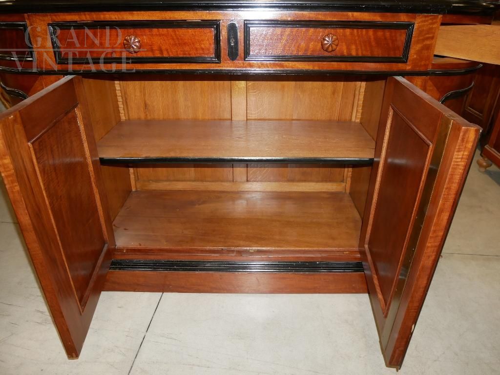 Bellissima credenza antica in noce con cornici ebanizzate, della seconda metà del 1800, di epoca Napoleone III°. Elegante modello sagomato dagli angoli arrotondati, con due ante centrali con due cassetti, e due ante e due cassetti sagomati ai lati. Completa di ripiani, serrature e chiavi funzionanti. Il mobile è stato completamente restaurato e verniciato con gommalacca data a mano. Epoca seconda metà del 1800, provenienza Francia.