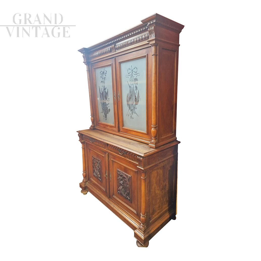 Credenza antica in noce scolpito con ante a vetro, Francia XIX secolo