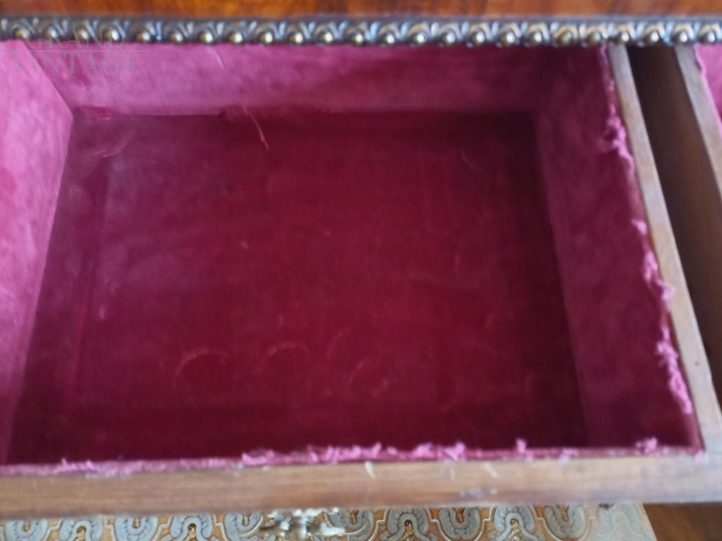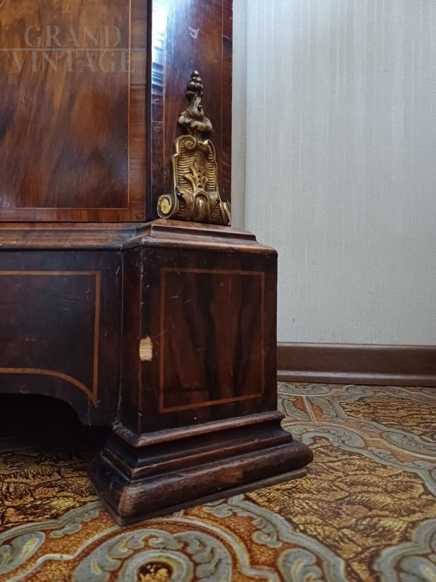 Credenza antica vittoriana a due ante in radica di noce, della seconda metà del XIX secolo, composta da due grandi ante con vetrate ovali incorniciate da una raffinata decorazione floreale dipinta a mano su fondo verde salvia, valorizzate da cornici dorate a rilievo. Fregi in bronzo dorato cesellato lungo i lati e la cimasa superiore. Interno rivestito in velluto porpora, a due livelli e quattro cassetti. Serratura originale a chiave funzionante.