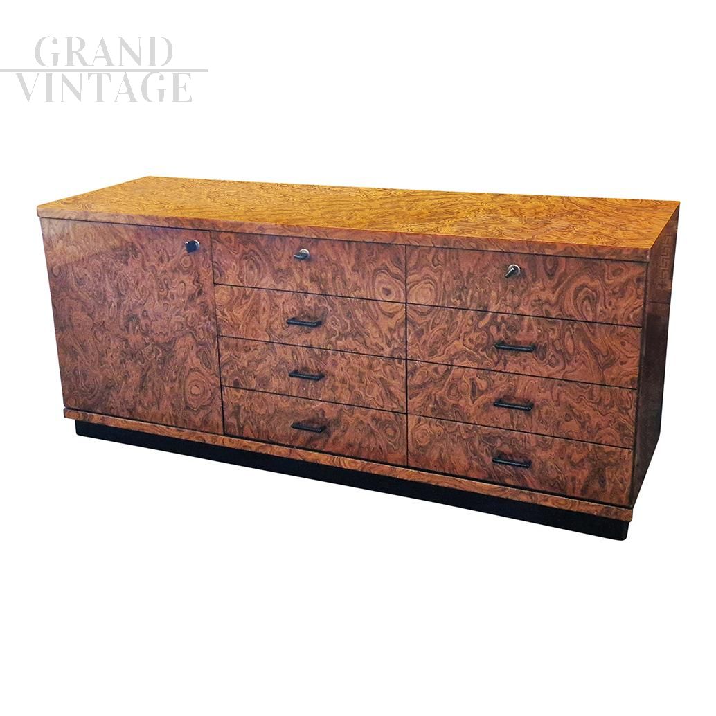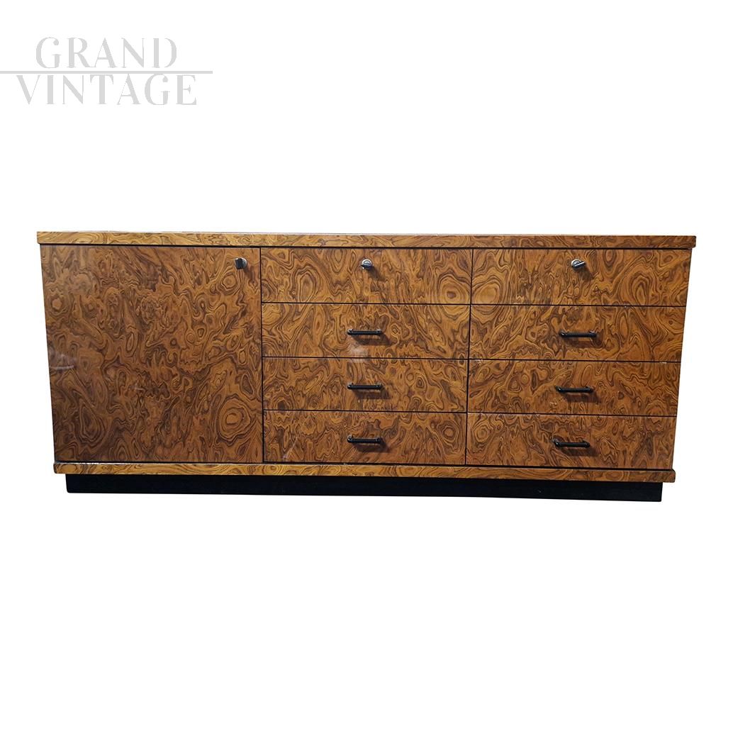 Splendida credenza buffet art déco rifinita in preziosa radica di thuja, realizzata nella metà del XX secolo. Il mobile è dotato di otto cassetti, di cui i due superiori con chiusura a chiave, e di un vano con anta, anch'essa con chiave, sul lato sinistro. Il mobile poggia su uno zoccolo laccato nero.