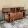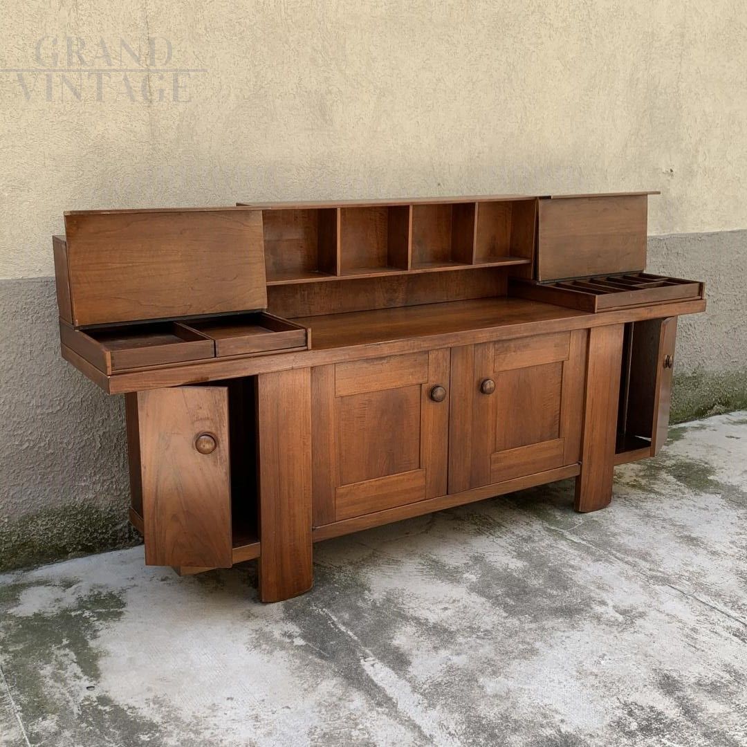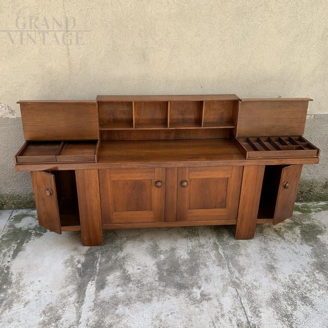 Mobile buffet italiano della metà del secolo disegnato da Silvio Coppola per Bernini. Questa credenza in noce presenta due ante terminali che rivelano ripiani regolabili su ogni lato, due ante centrali ciascuna con ripiano regolabile e una parte superiore appoggiata con diversi contenitori / espositori e due aree contenitori sollevabili.