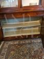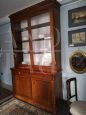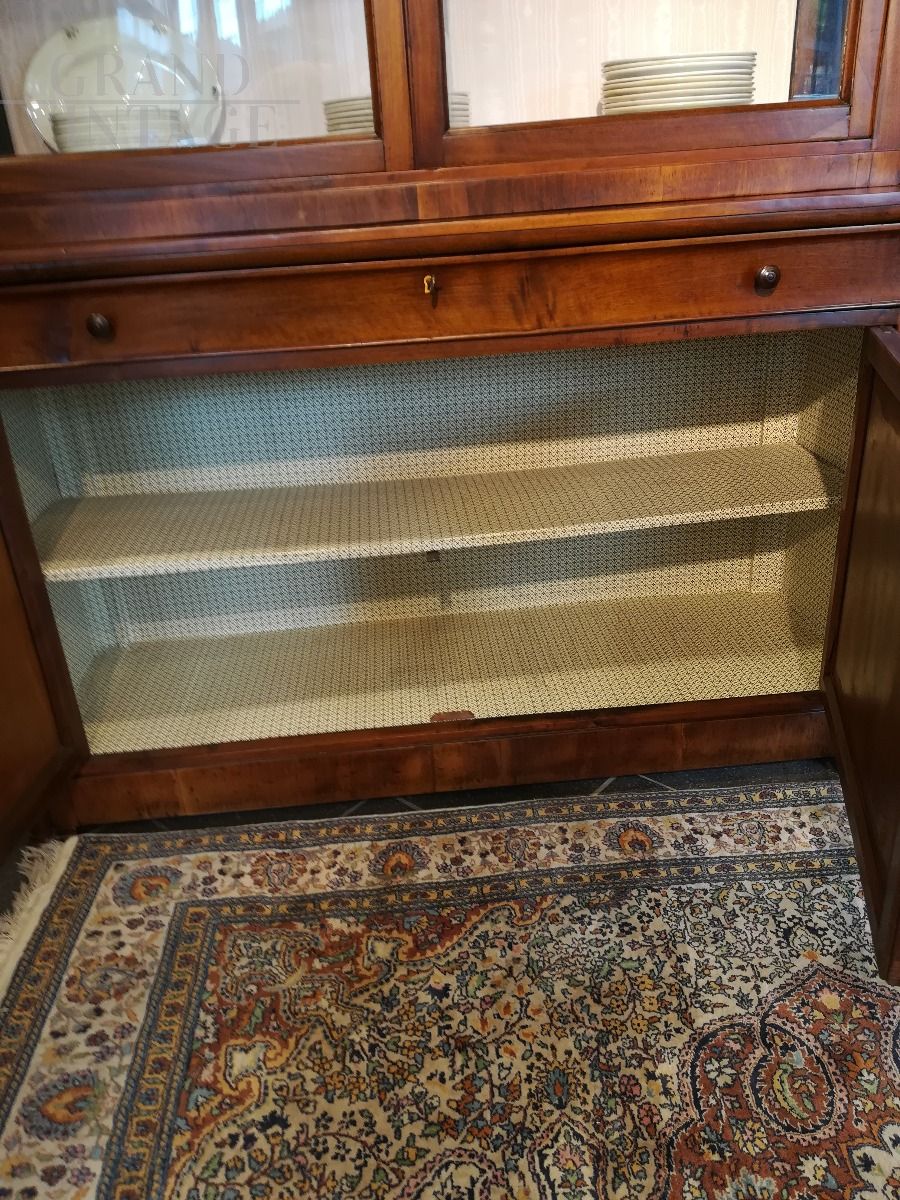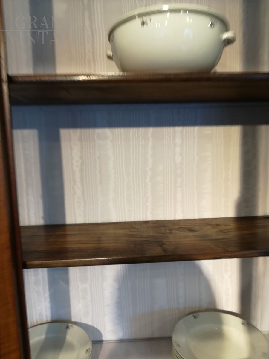 La vetrina superiore ha due ante e all'interno vi sono dei ripiani intercambiabili con reggipiani "a scaletta" foderati in tessuto bianco Moirè.