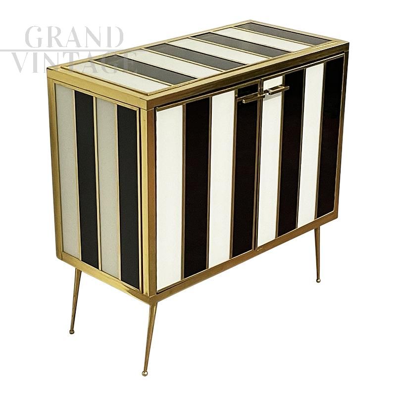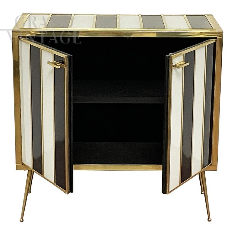 Credenza a due ante interamente realizzata a mano con struttura in legno ricoperta con strisce in vetro bianco e nero; profili, finiture, maniglie e piedi in ottone dorato, dotata di ripiano interno.
