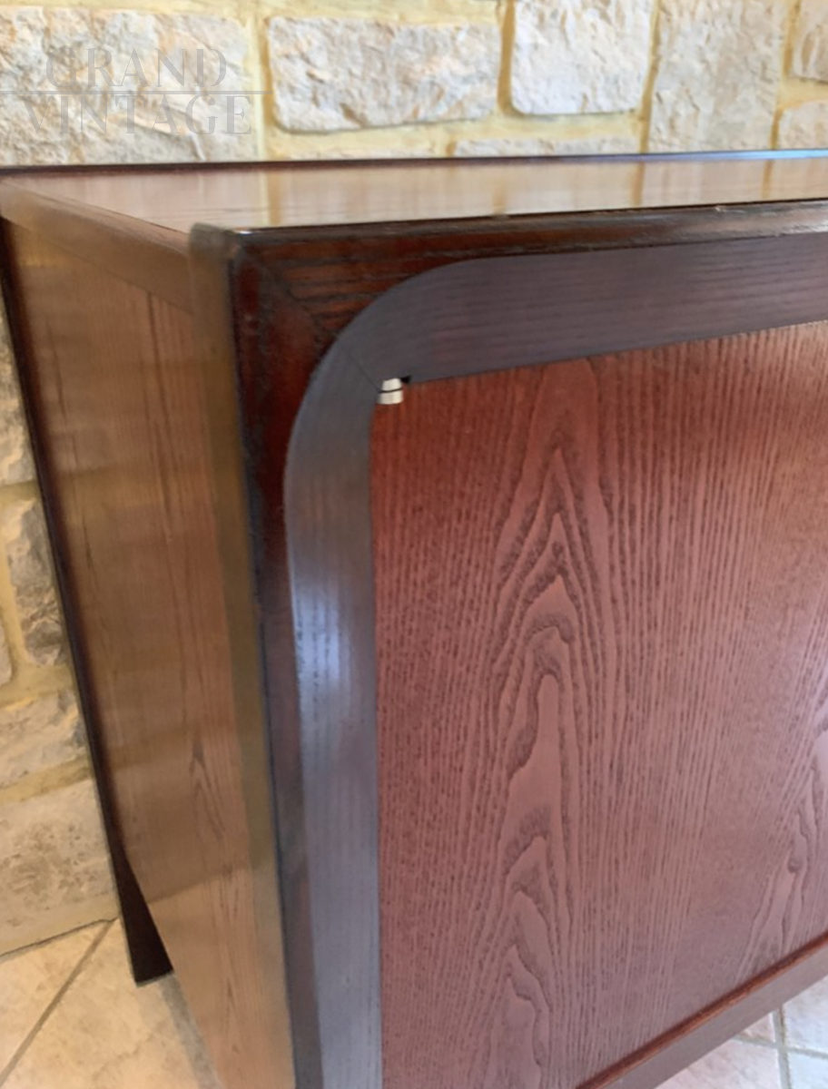 Credenza vintage da centro di gusto scandinavo, perfetta come mobile da ufficio, anni '70. Il mobile può essere utilizzato come divisorio, la parte posteriore è elaborata come la parte anteriore, ed è composto da 2 doppie ante con 2 vani portaoggetti ciascuna, incluso un ripiano (ripiani regolabili in altezza).