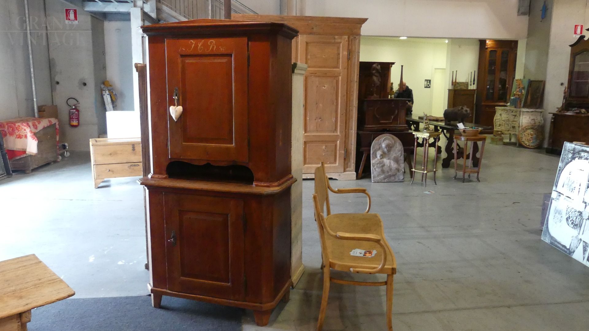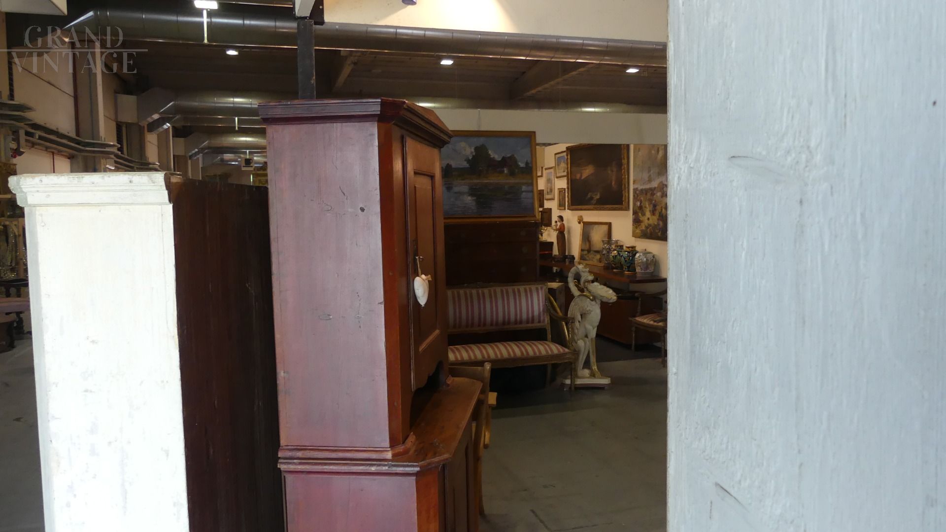 Piccola credenza alta antica a due corpi del 1859, prodotta in legno di pino Svedese, il legno si presenta di un bel colore rosso.