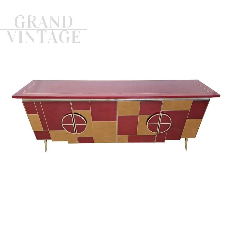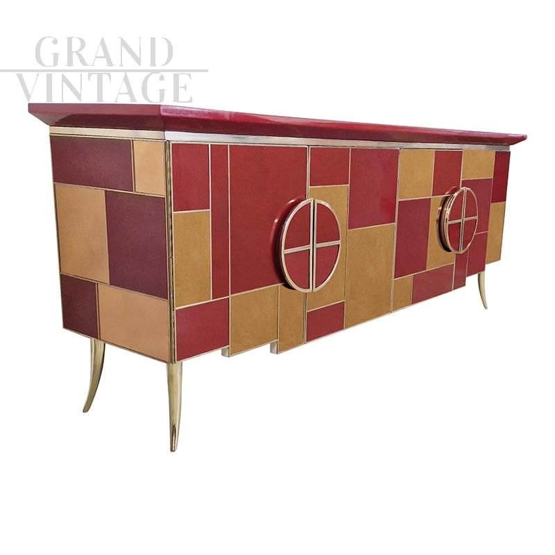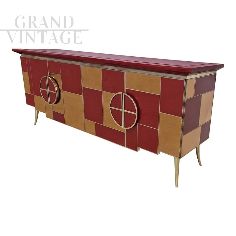 Credenza a quattro ante e due vani, ciascuno con ripiano interno, interamente realizzata a mano, con struttura in legno rivestita in elementi quadrati e rettangolari in specchio e vetro rosso bordeaux. Il piano è in legno laccato bordeaux lungo tutto il perimetro e la parte centrale è in vetro rosso. Strip led per illuminazione a perimetro delle maniglie ed illuminazione interna; profili e piedi in ottone dorato.