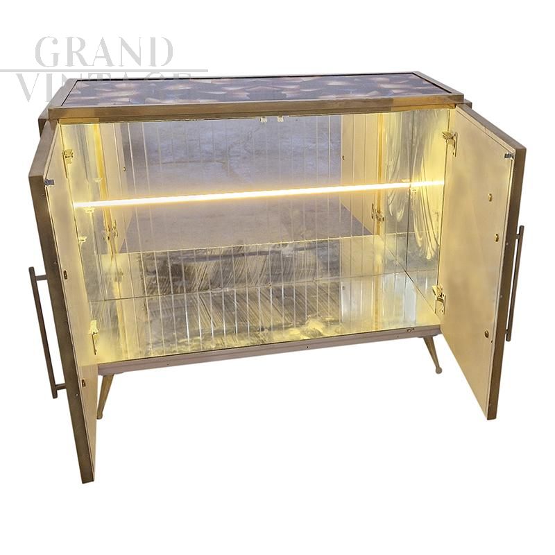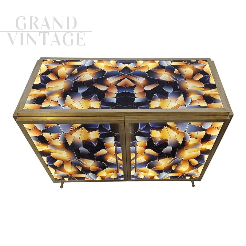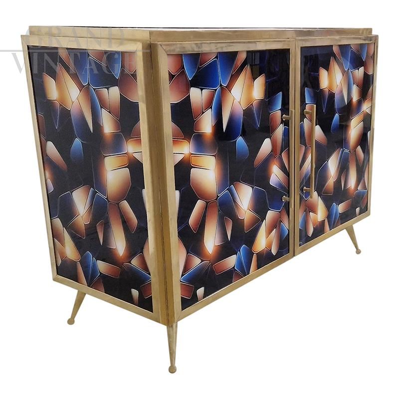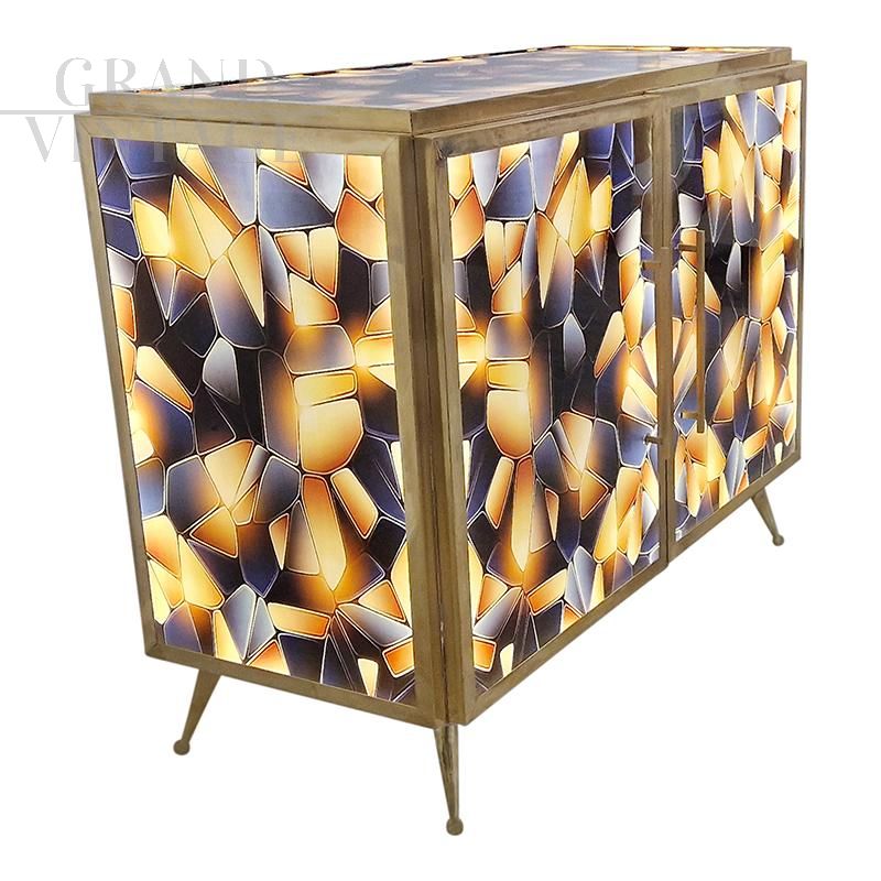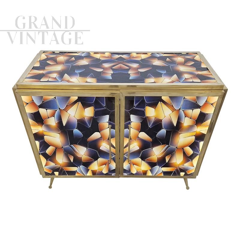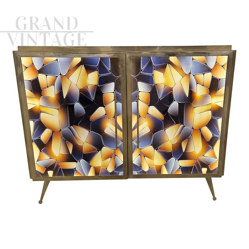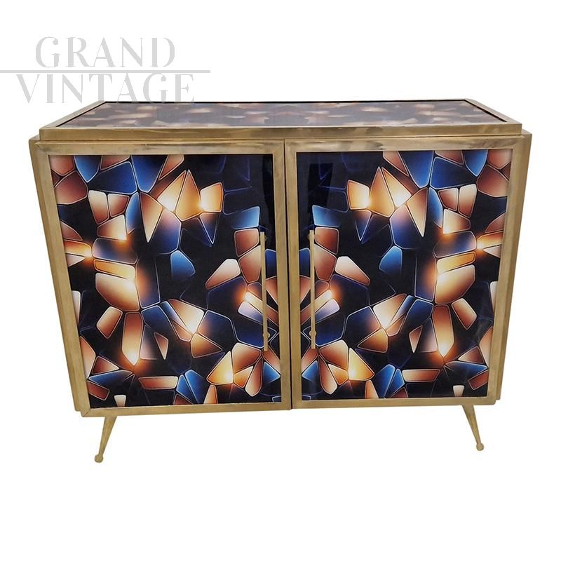 Credenza in vetro artistico multicolore due ante e con ripiano interno in vetro, interamente realizzata a mano, struttura in legno rivestita vetro stampato nelle tonalità del blu, marrone e oro, maniglie, profili e piedi in ottone dorato. Interno specchiato e illuminato. La struttura si illumina con luce a gradazione con apposito telecomando.